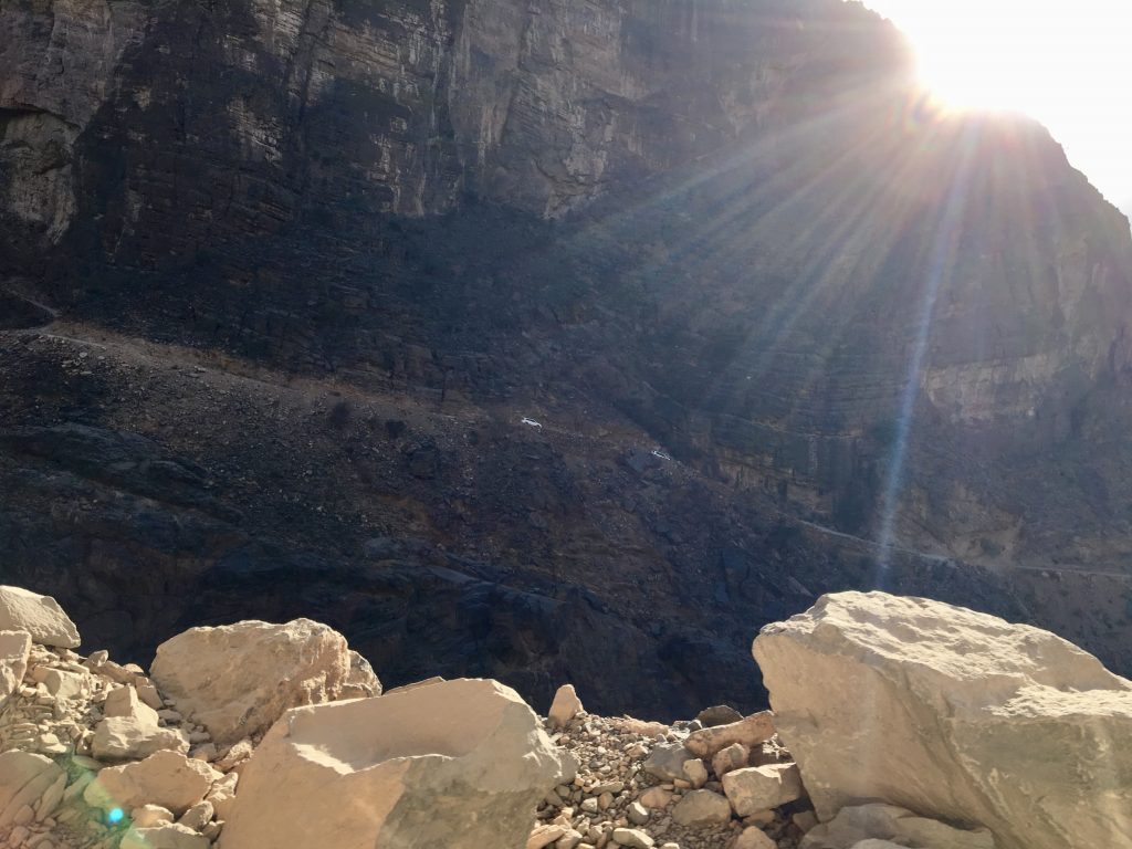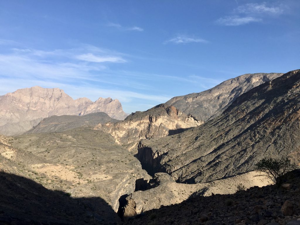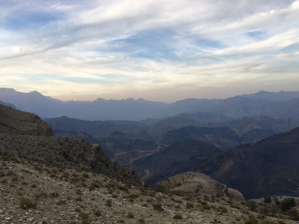Mascate est coincée entre mer et montagnes et s’étend comme un ruban sur des dizaines de kilomètres. La chaîne de montagne vers laquelle nous nous dirigeons semble bien grise mais nous réalisons très vite que, malgré tout ces rochers et cet aspect si aride, elle est parsemée de touches de verdure où se nichent les villages.