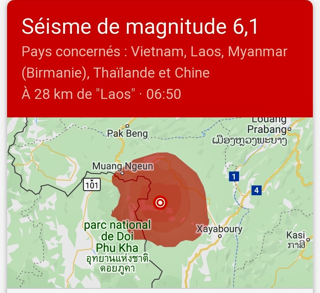 Et deux jours plus tard, la terre a tremblé juste là où nous sommes passés au Laos, entre Xayaboury et Pak Beng, et la route a été fissurée.