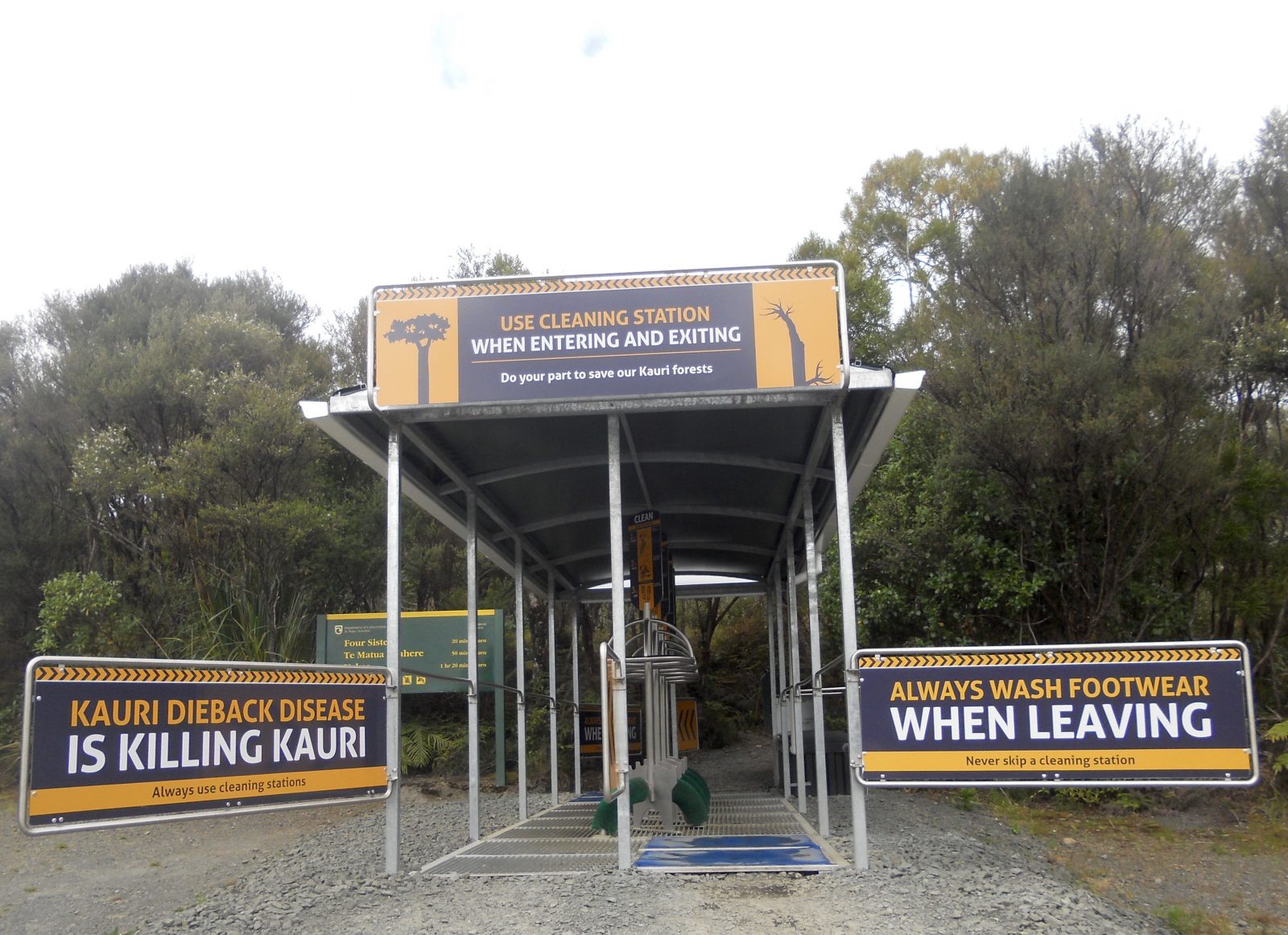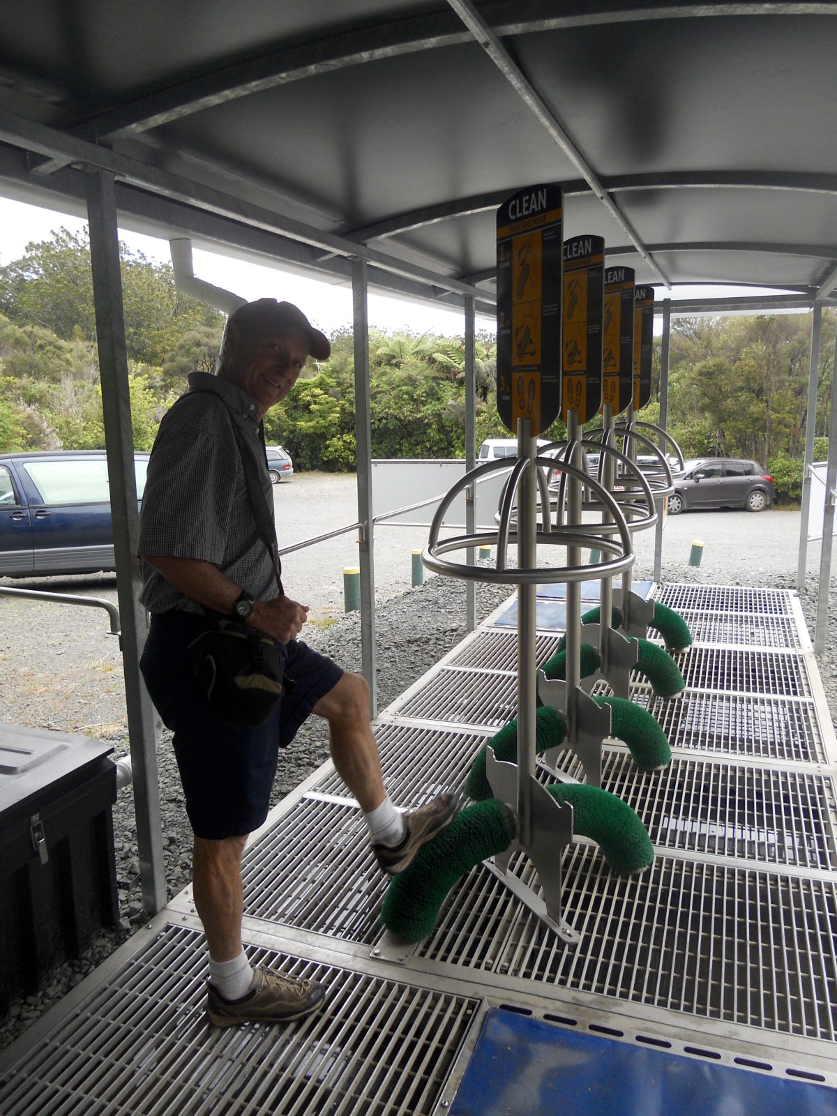 Malheureusement, ils sont attaqués insidieusement par de vilains champignons qui les détruisent complètement. Alors pour empêcher la propagation des spores, il faut laver ses semelles avant de rentrer mais aussi en sortant du parc. Philippe a rempli son devoir civique avec complaisance, vous êtes témoins, mais c’est une autre histoire pour les opossums, kiwis et autres bestioles qui rôdent dans les parages sans jamais laver leurs pattes. Je commence à comprendre pourquoi les néo-zélandais, comme les australiens, sont si exigeants sur la propreté des motos que l’on importe.