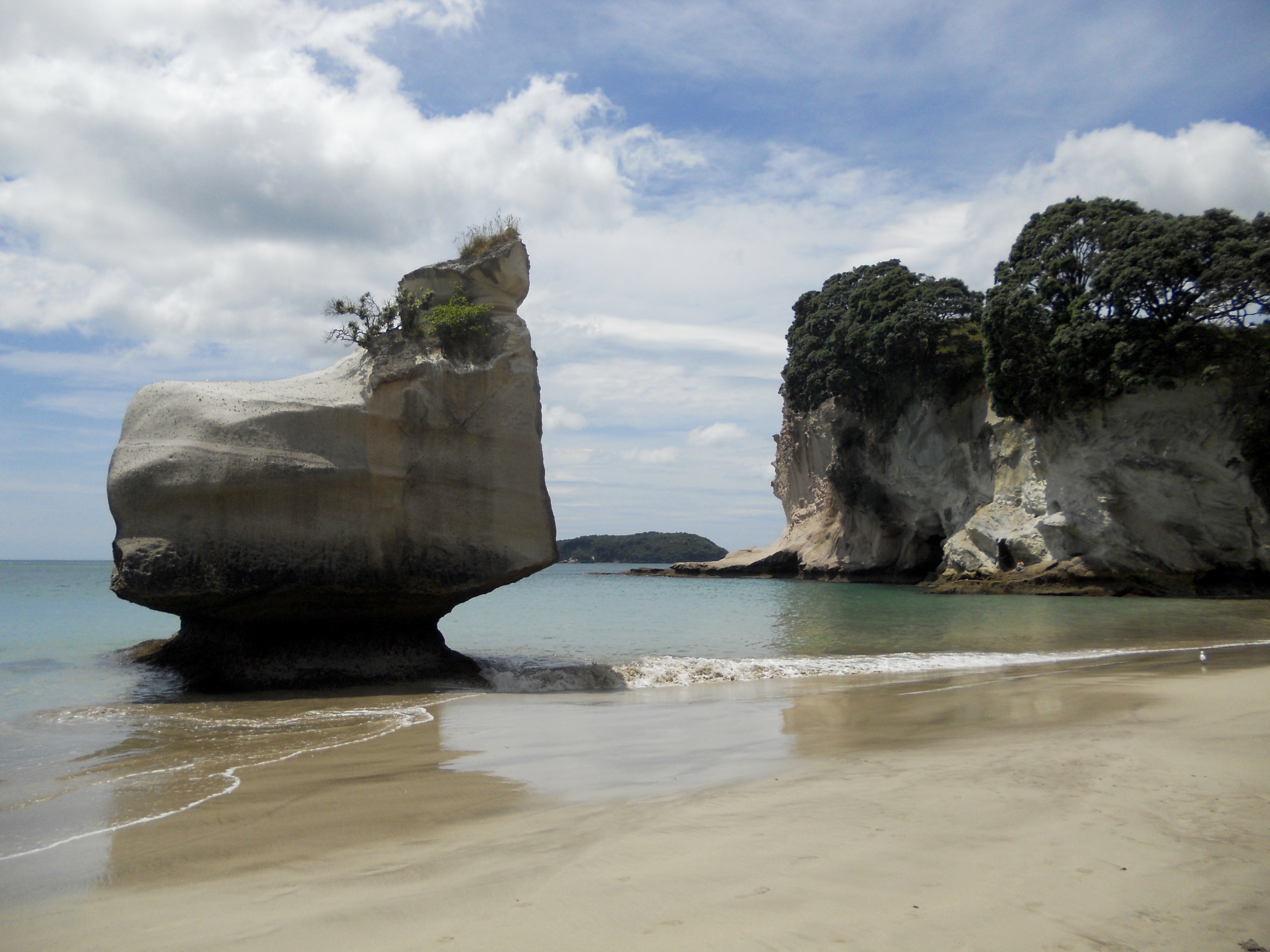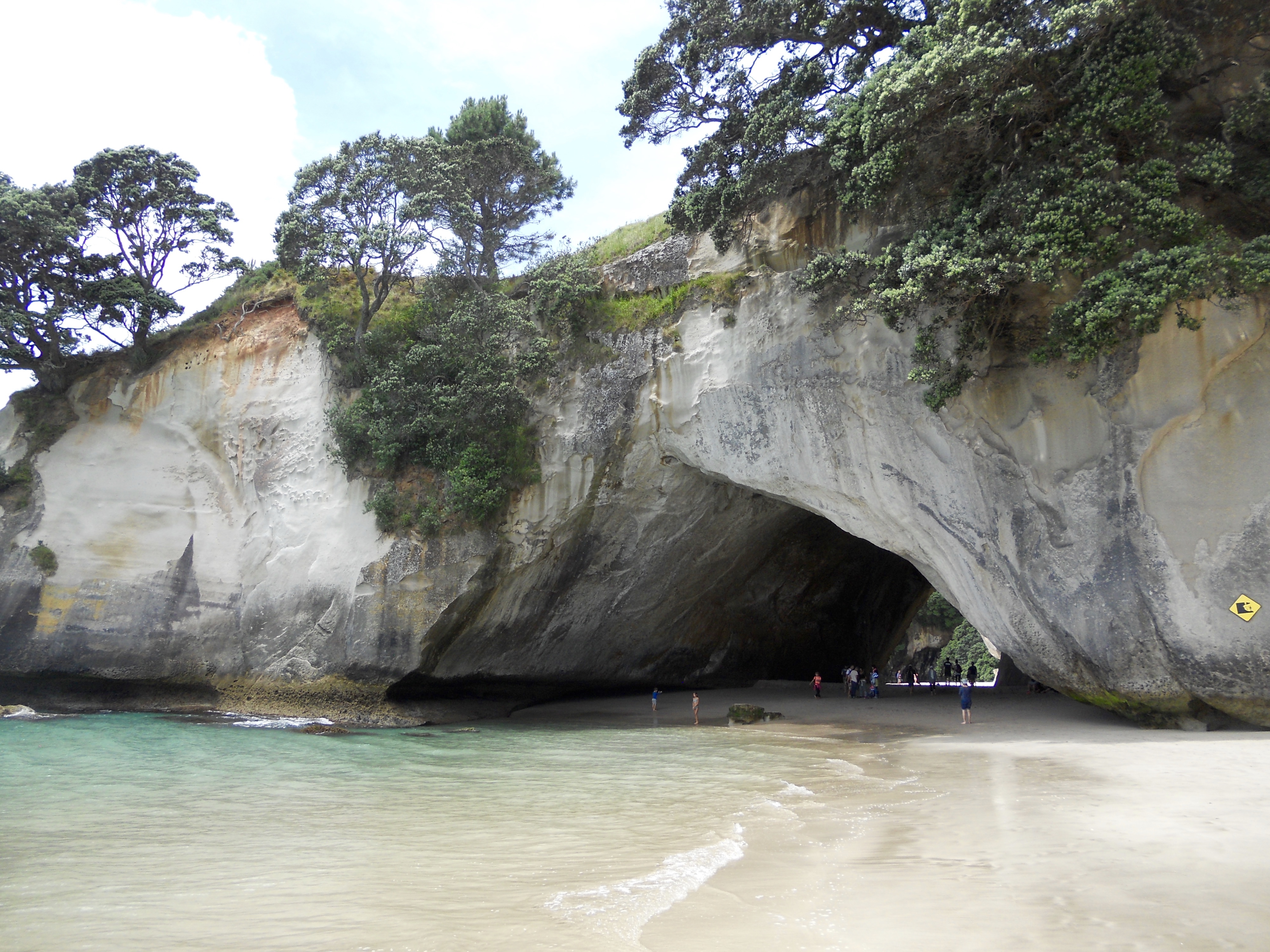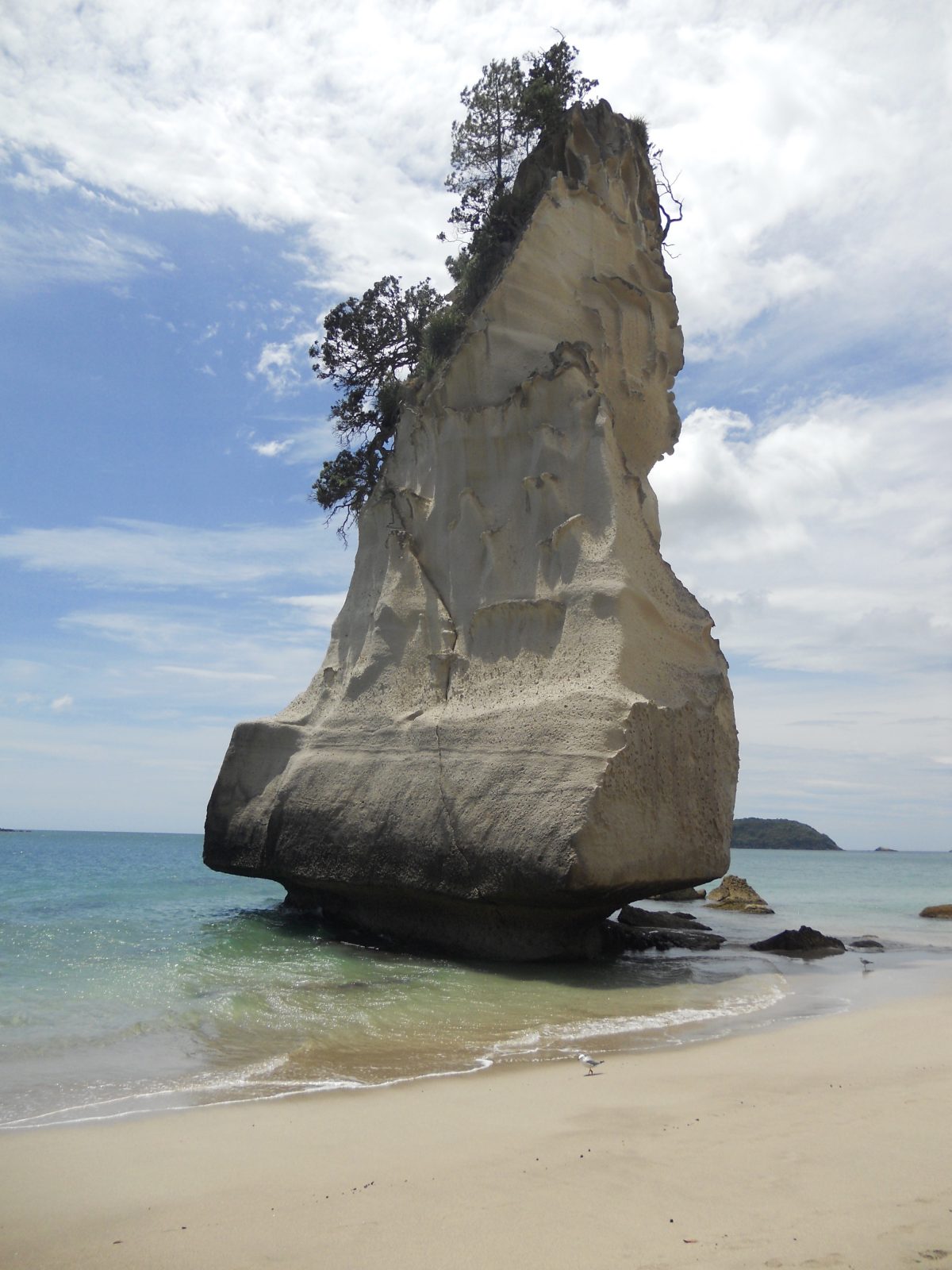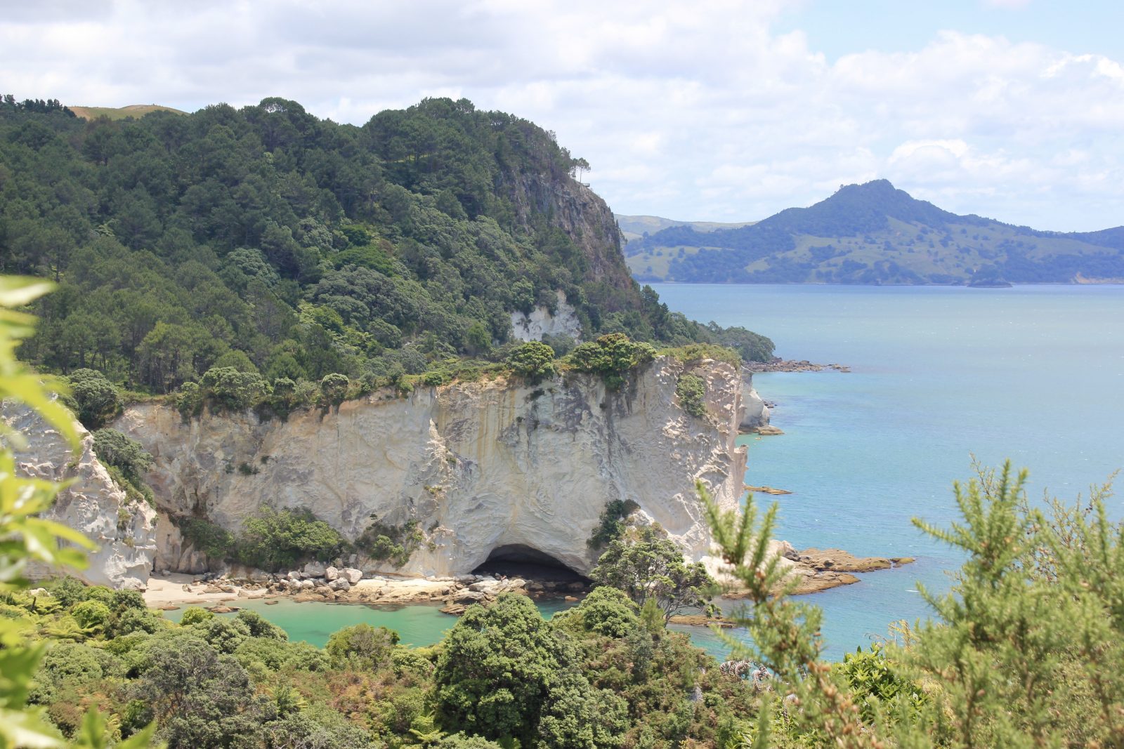 Quelle journée magnifique, je retire tout ce que j’ai dit hier! Du soleil, la température a atteint des sommets inconcevables pour nous jusqu’alors en NZ, 24 degrés, oui, vous avez bien lu, 24! Des routes superbes pleines de virages, un joli chemin côtier pour se retrouver à Cathedral Cove, une arche grandiose dans une crique superbe.