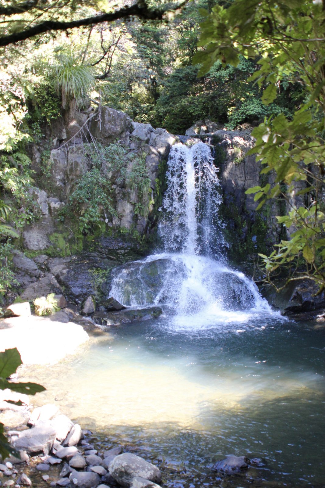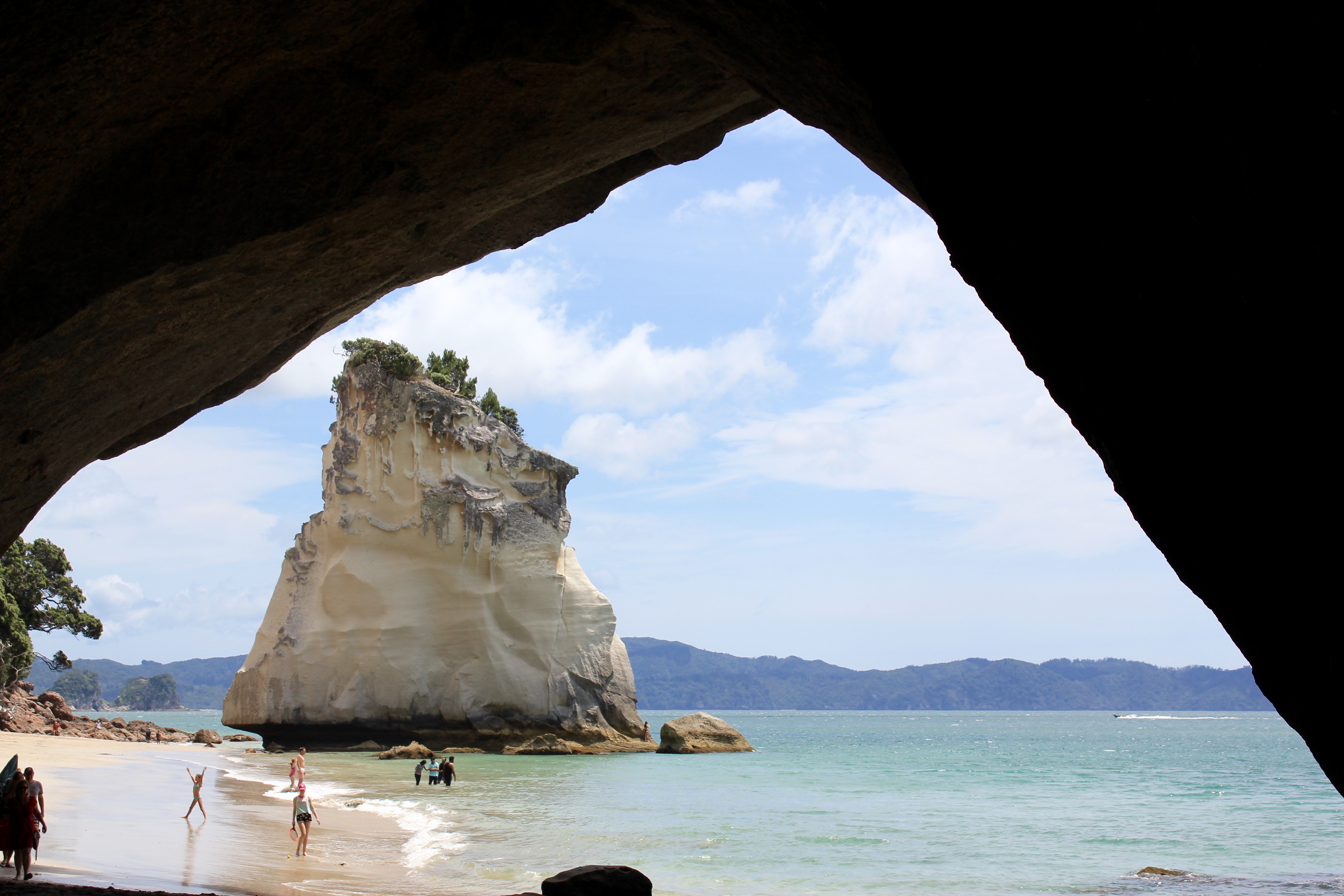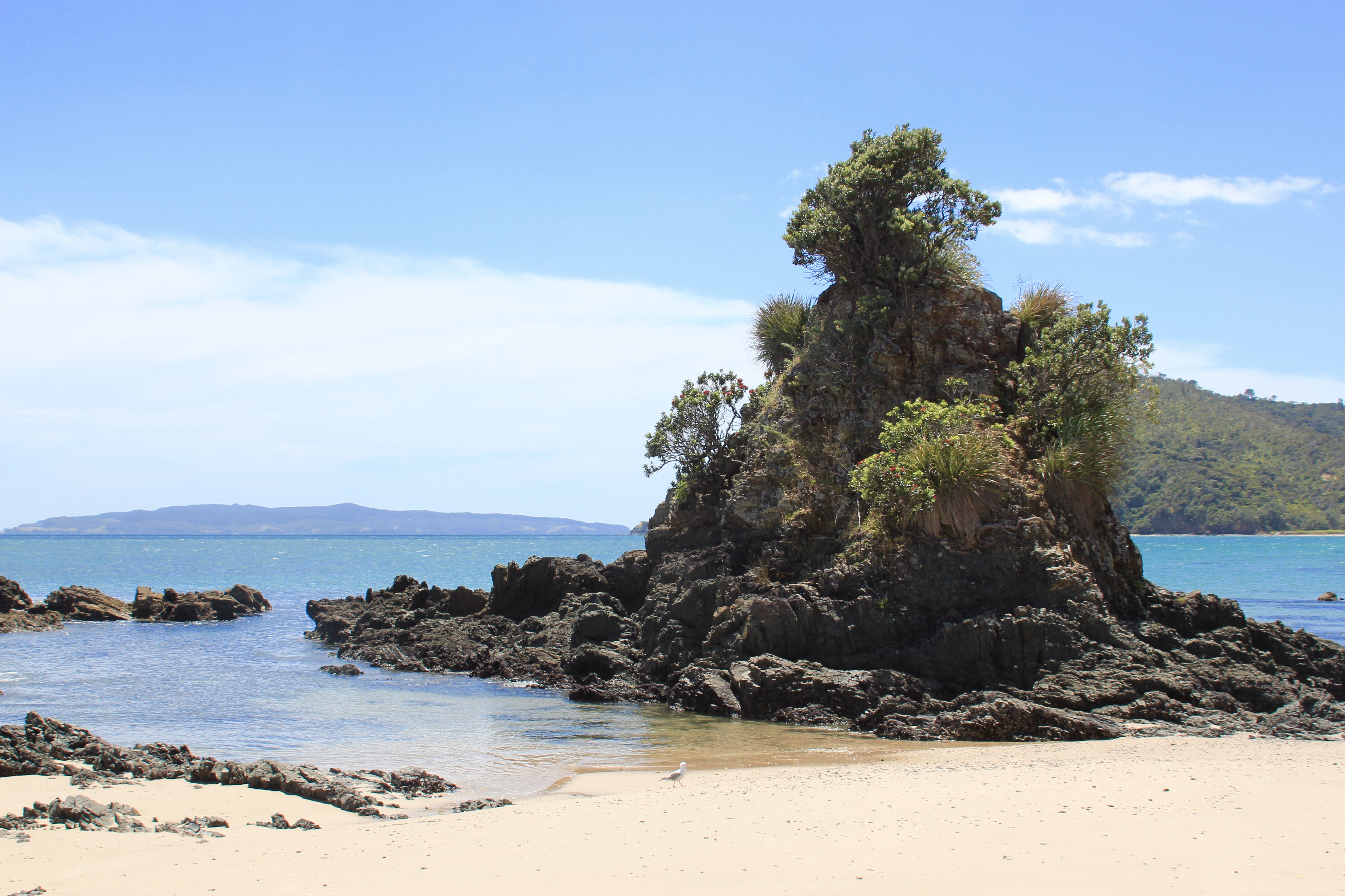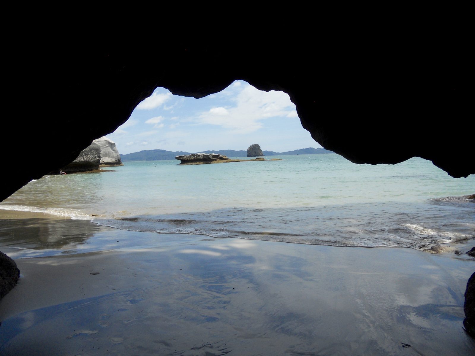 Quelle journée magnifique, je retire tout ce que j’ai dit hier! Du soleil, la température a atteint des sommets inconcevables pour nous jusqu’alors en NZ, 24 degrés, oui, vous avez bien lu, 24! Des routes superbes pleines de virages, un joli chemin côtier pour se retrouver à Cathedral Cove, une arche grandiose dans une crique superbe.