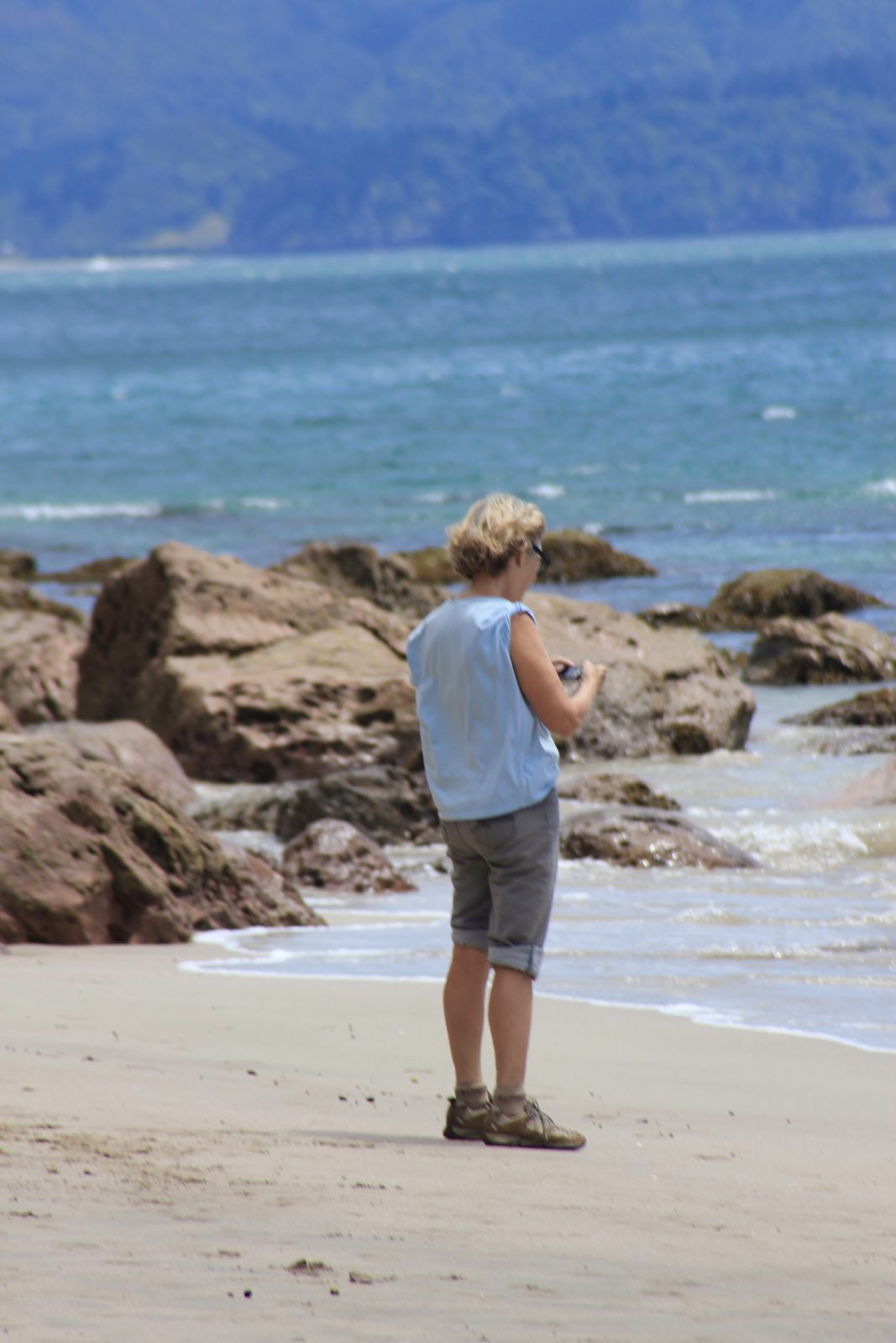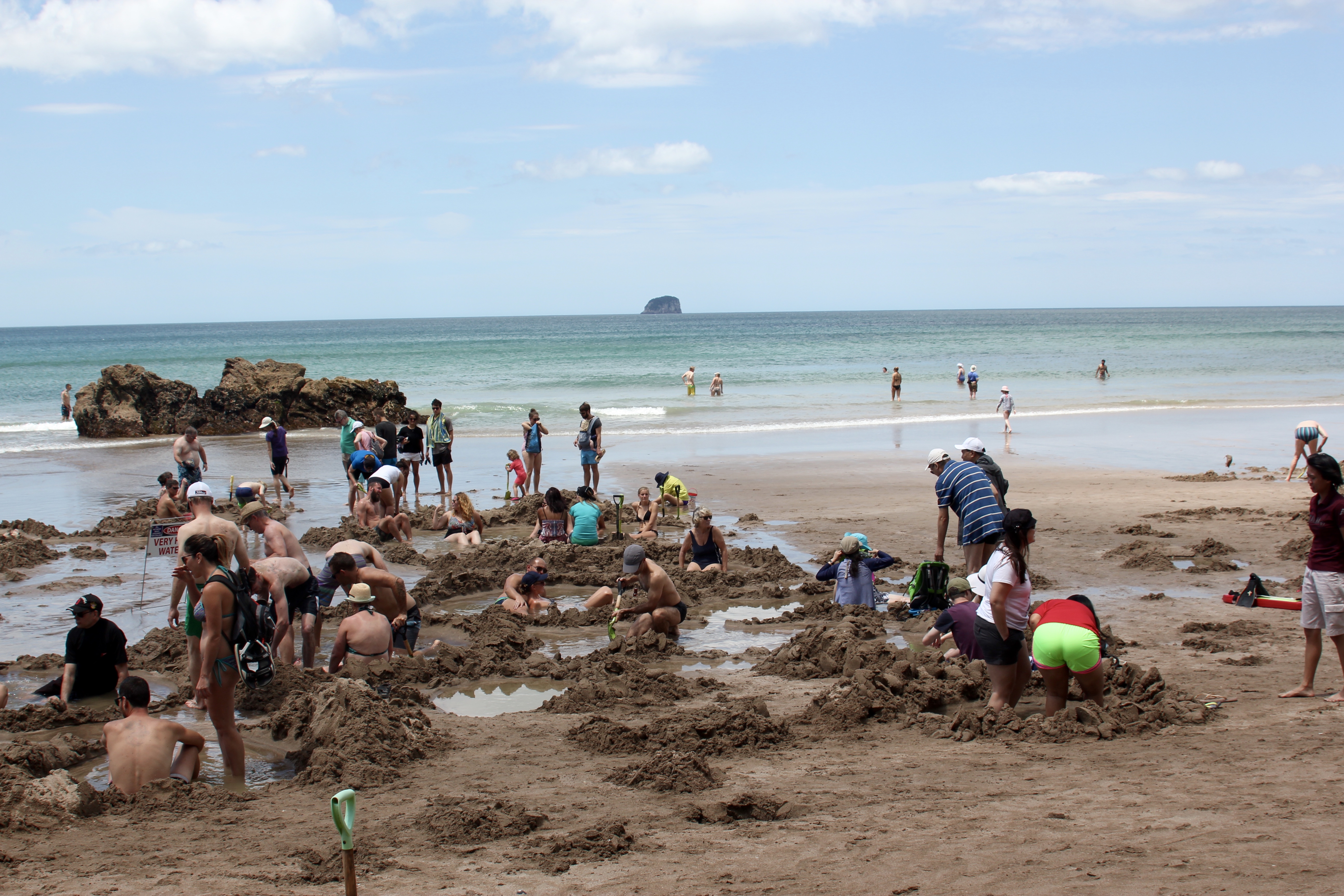 Puis Hot Water beach, une plage sous laquelle sommeillent des eaux bouillonnantes (souvenez-vous, nous sommes ici sur une faille) qui ne demandent qu’à remonter à la surface si on se donne la peine de creuser un peu dans le sable. Et voilà tous les badauds arpentant ce petit bout de plage avec leur seau et leur pelle, comme les petits enfants qu’ils sont redevenus, pour trouver la meilleure place. Nous n’avions pas de pelle dans nos sacoches, mais nous avons trouvé un spot génial, et Pilou s’en est donné à coeur joie pour faire des barrages qui régulent le flot d’eau chaude: un spa personnel sur mesure à chaleur réglable. Nous avons donc barboté quelque temps dans notre baignoire de sable.