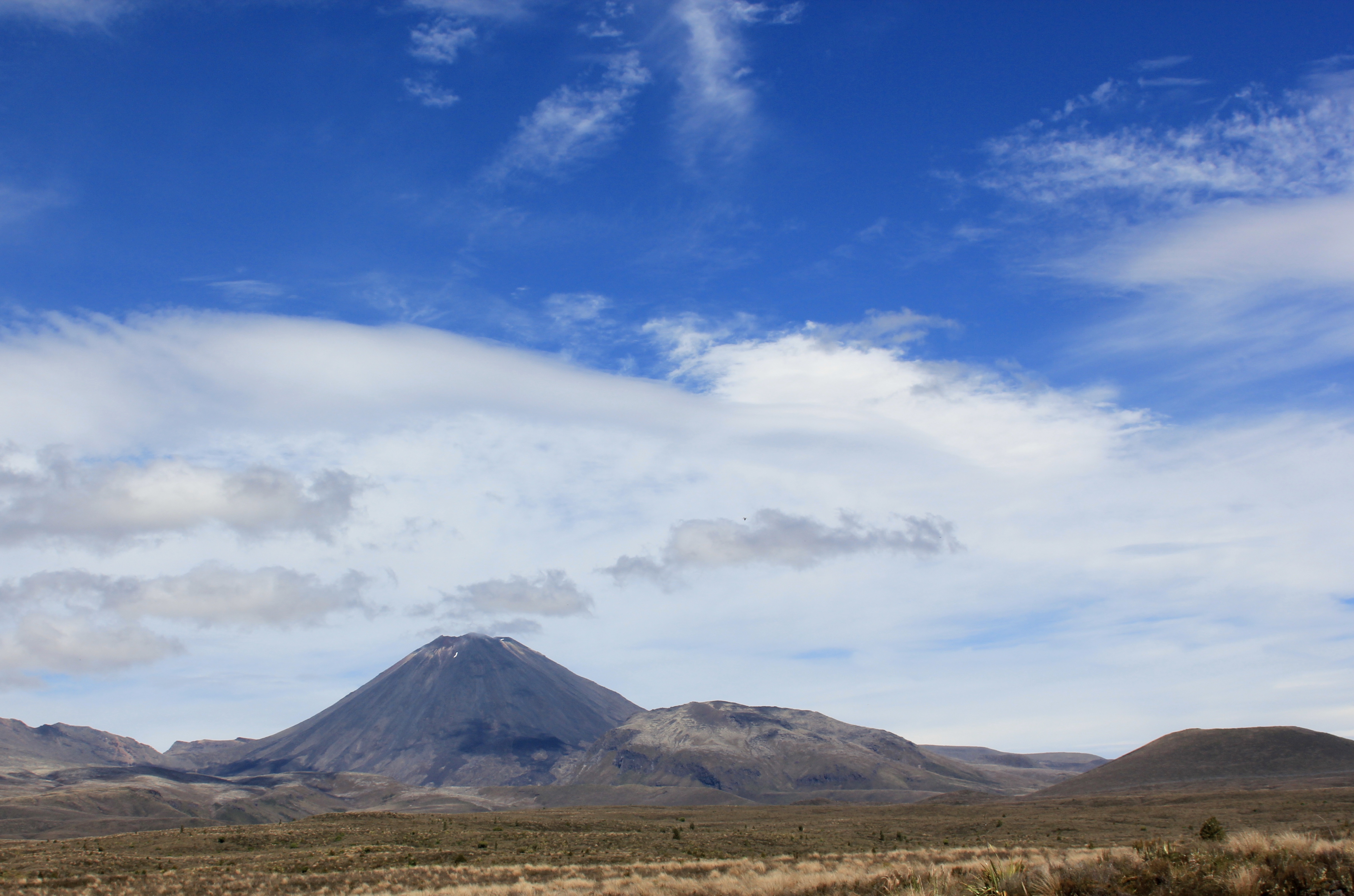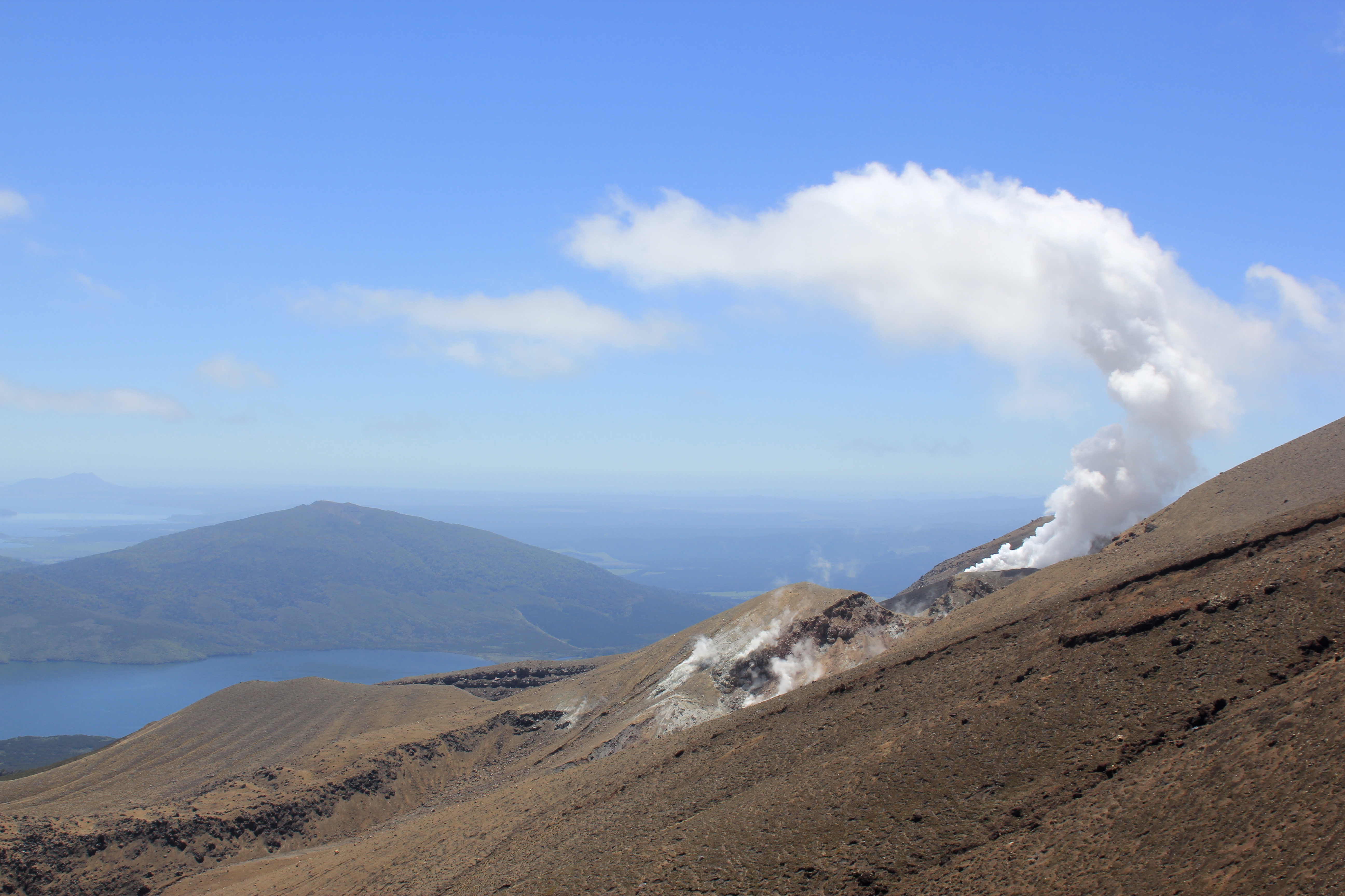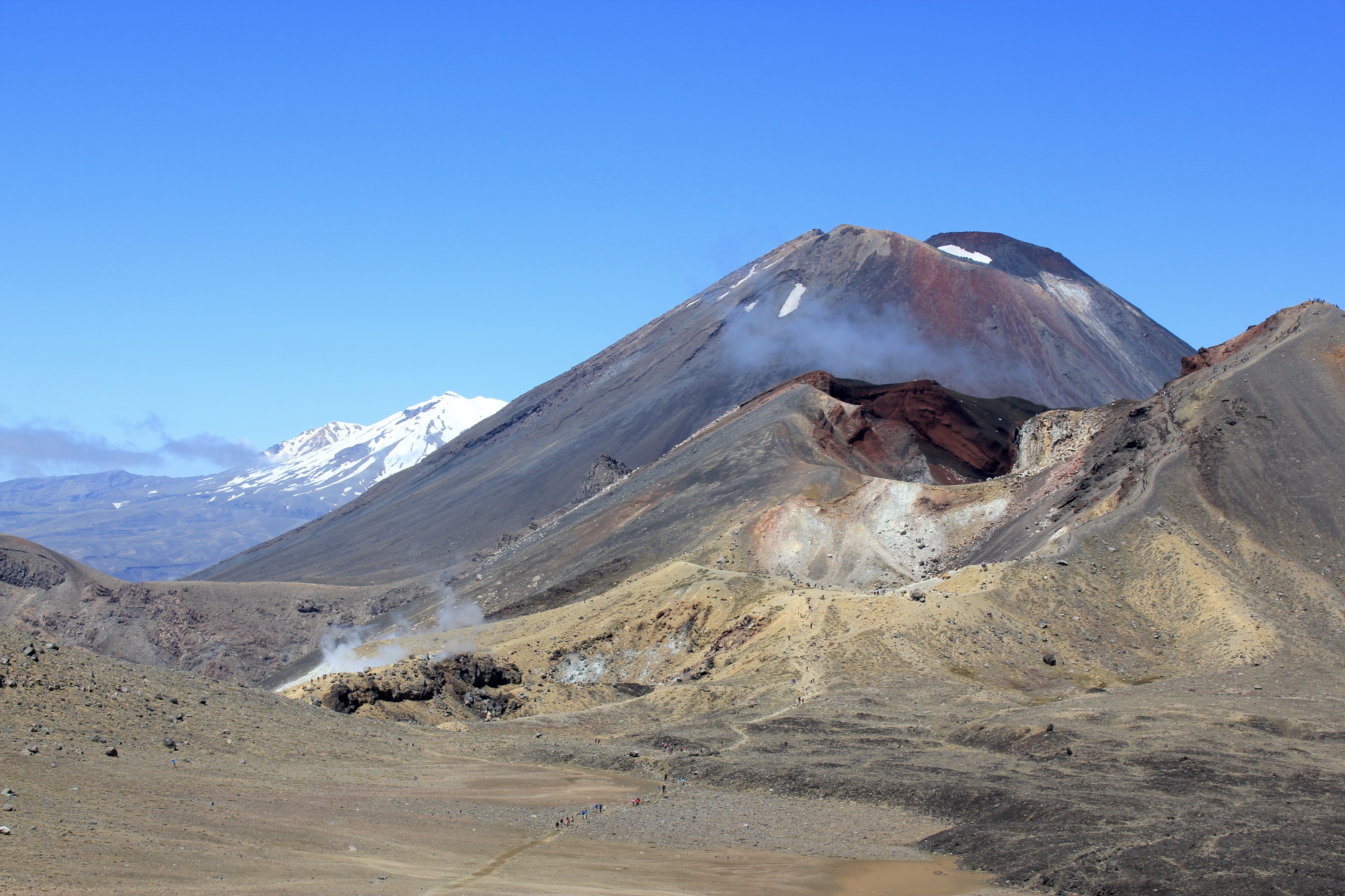 La route longe le lac Taupo, superbe dans sa caldera sur 600 km² avec en arrière plan des montagnes de plus en plus hautes dont nous nous approchons. Direction le parc national Tongariro, volcans avec fumerolles et sommet enneigé.