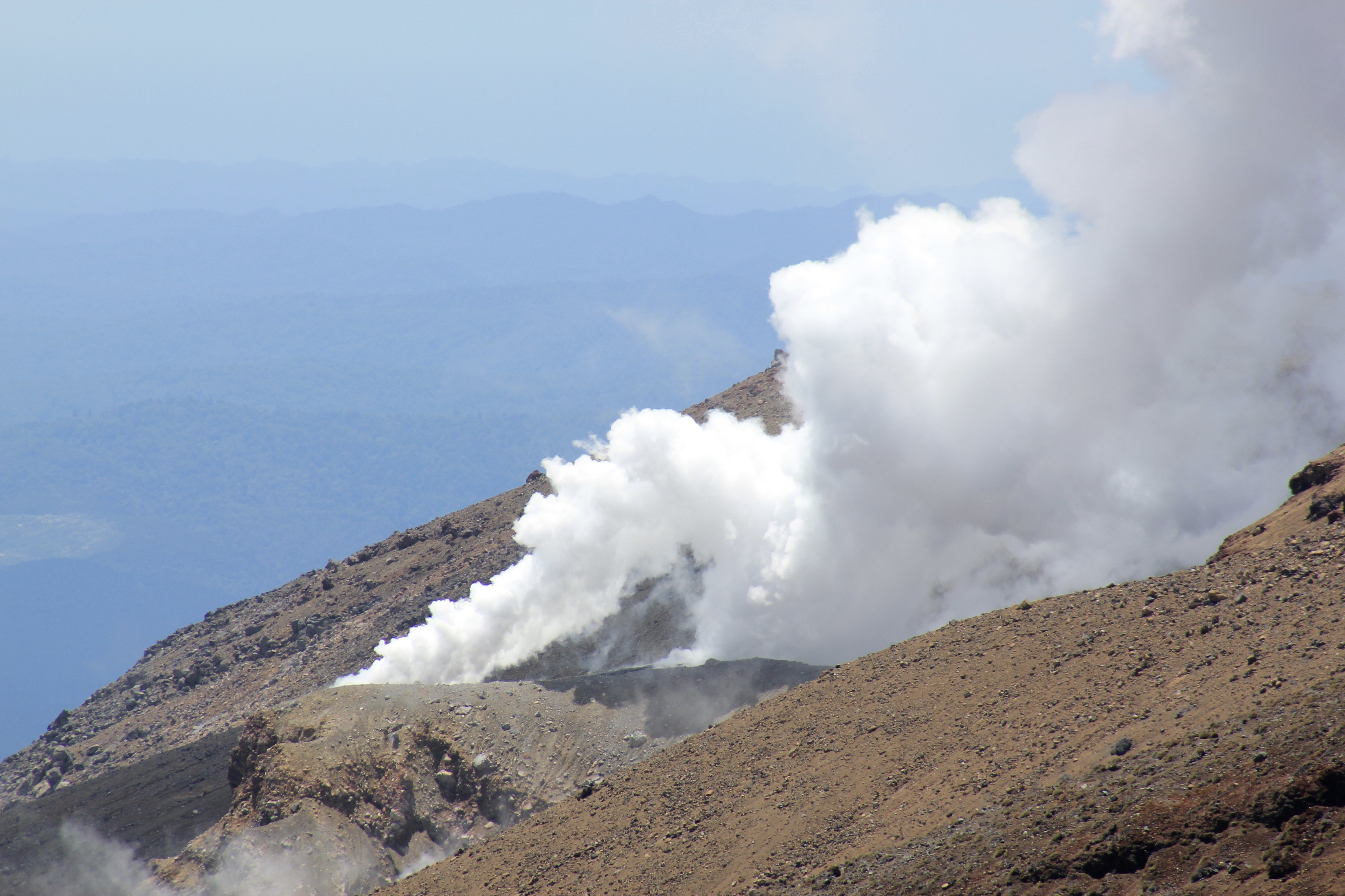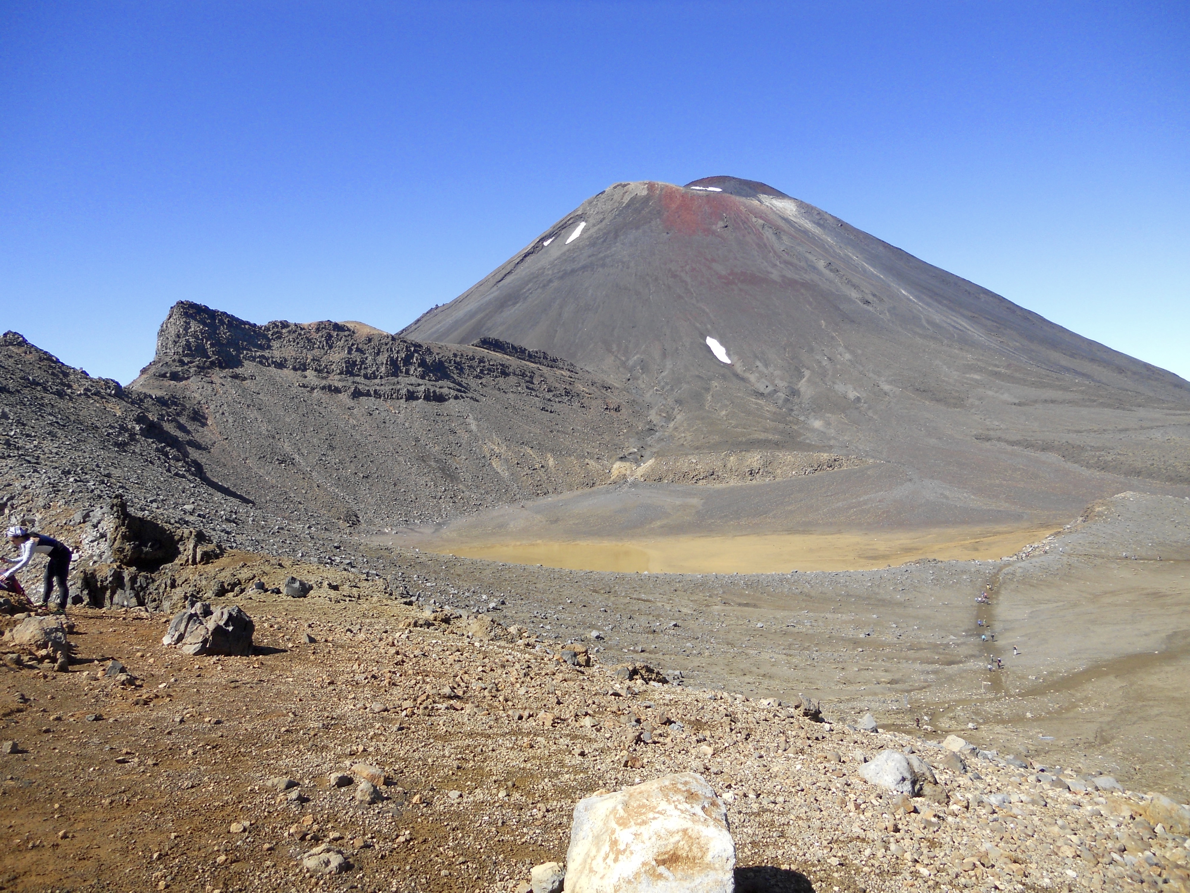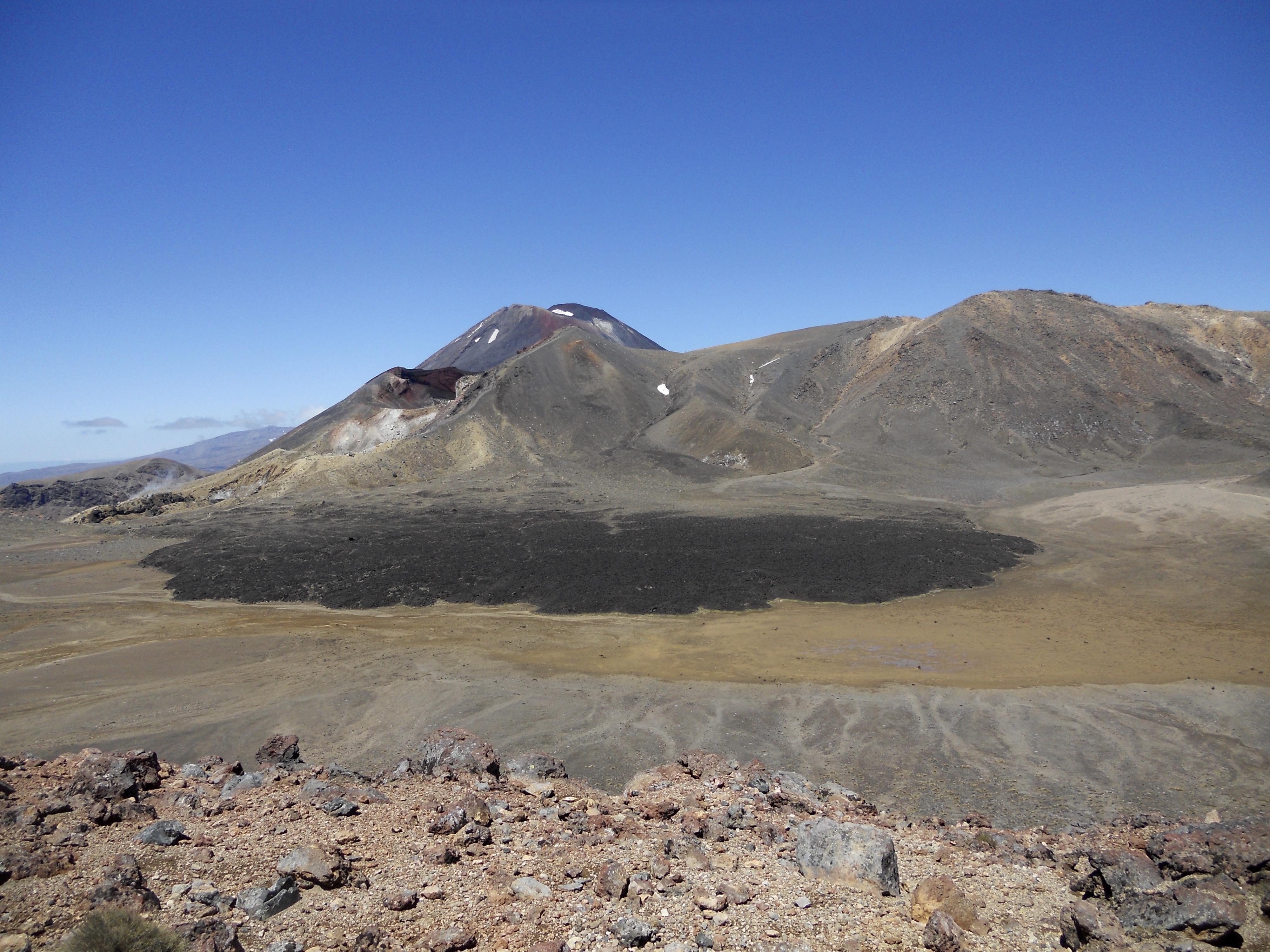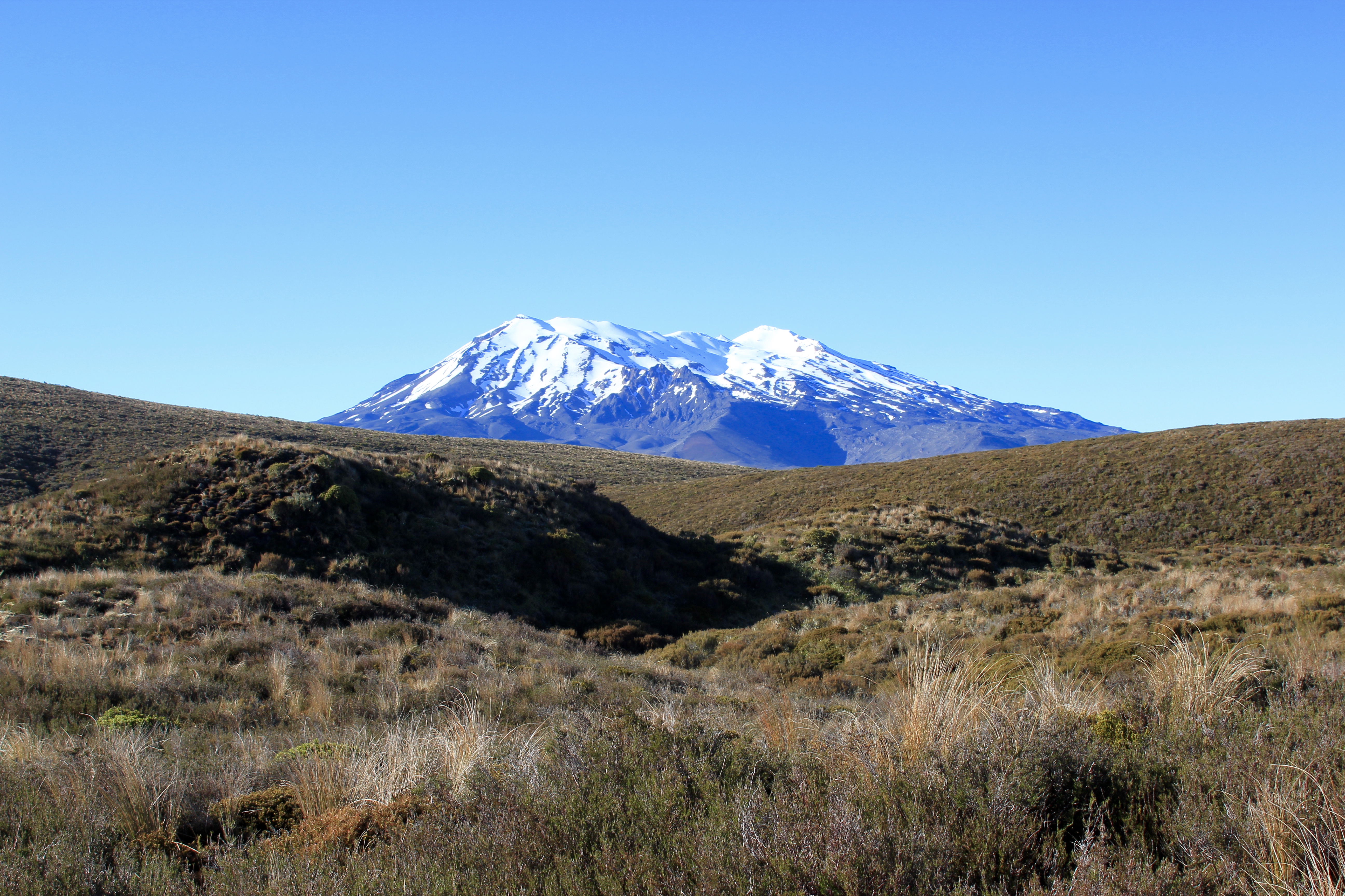 La route longe le lac Taupo, superbe dans sa caldera sur 600 km² avec en arrière plan des montagnes de plus en plus hautes dont nous nous approchons. Direction le parc national Tongariro, volcans avec fumerolles et sommet enneigé.