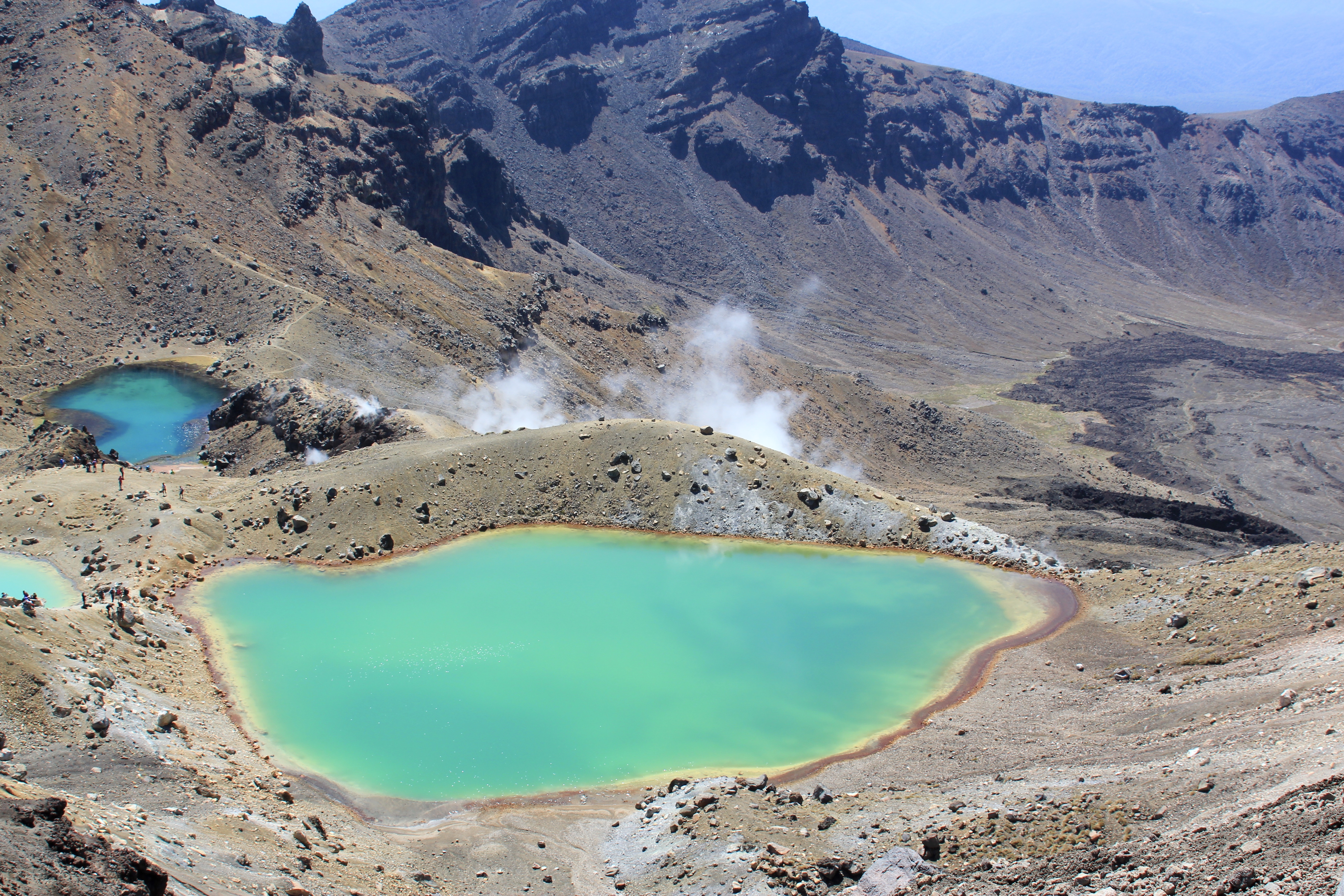 Départ matinal pour aller marcher sur les volcans en parcourant le Tongariro Alpine Crossing, une superbe rando, une des « New Zealand Great Walks ». Un paysage très minéral, des lacs aux couleurs surnaturelles, des fumées volcaniques qui sortent de partout avec une forte odeur de souffre. Nous n’étions pas tout seuls, mais que c’était beau!