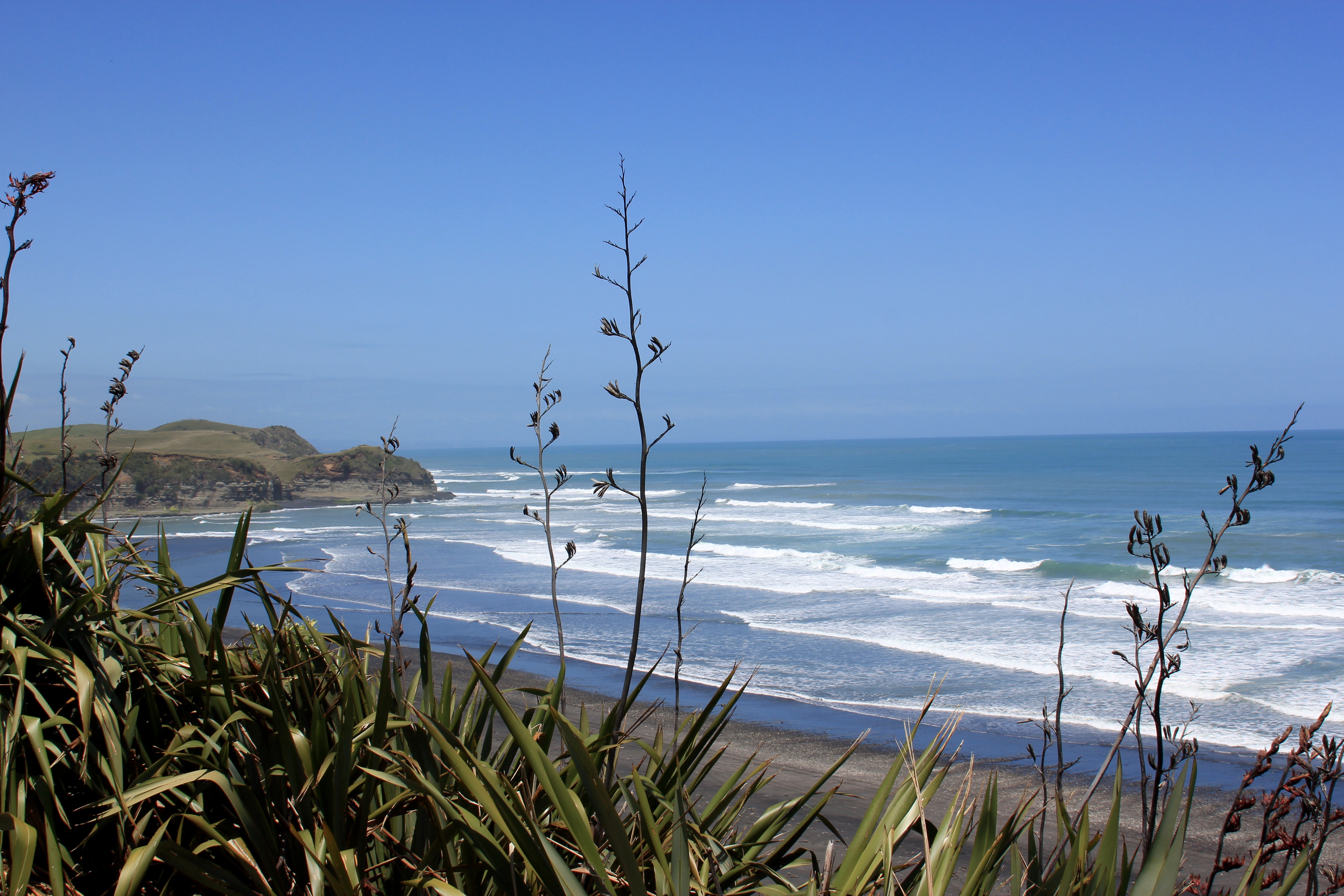 Pour la première journée de l’été, nous avons été gâtés: une campagne vallonnée et tellement belle qu’elle donnerait envie à tous les aficionados du trottoir parisien de se mettre au vert pour élever des moutons et faire du fromage de brebis, bio naturellement. Une route à atteindre les sommets du hit-parade des routes « à ne manquer sous aucun prétexte » si tous les motards de France et de Navarre avaient comme nous la chance de les sillonner sous le soleil. Un ciel plus bleu que les pavés d’Ostie. Un volcan enneigé digne des plus beaux manuels de géographie. La mer qui apparait, turquoise, au détour de la route alors que nous n’avons pas encore quitté les montagnes. Une longue promenade sur un chemin en bord de mer jusqu’au pont Te Rewa Rewa aux courbes magnifiques. Et pour finir, un dîner paisible sur le deck de notre hôte airbnb avec une poule et trois chats bien câlins.