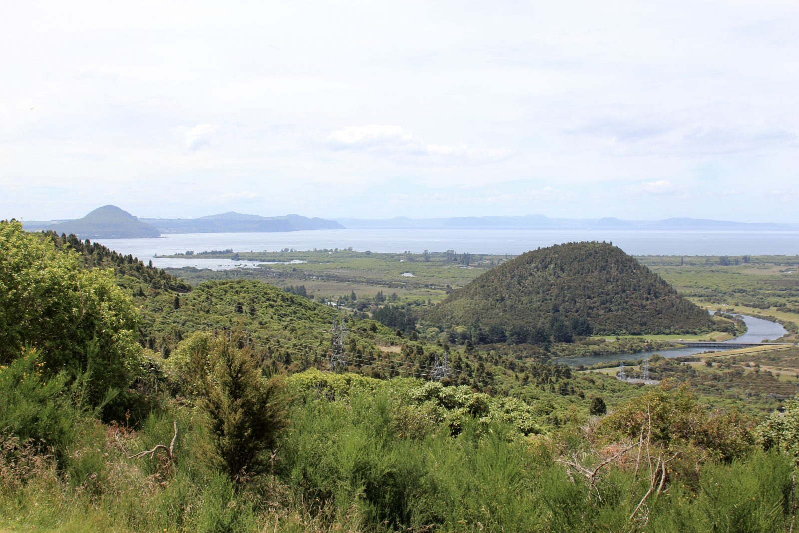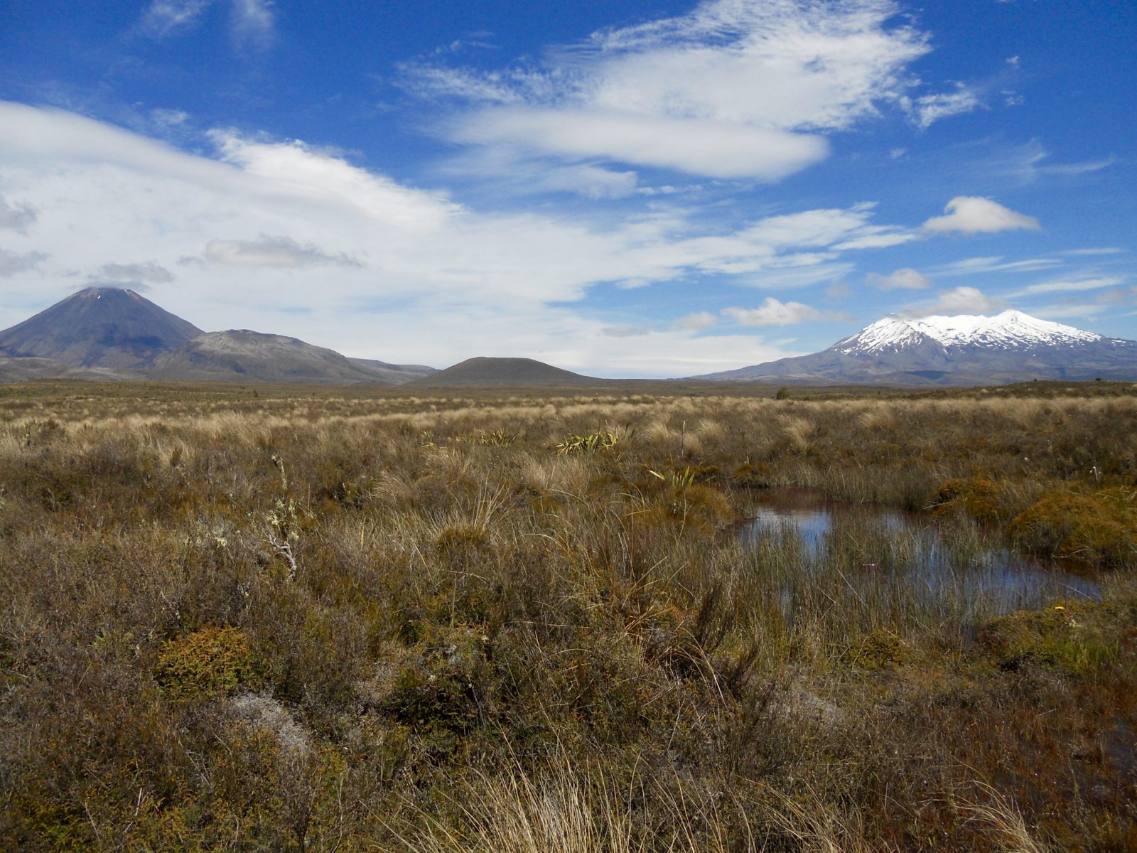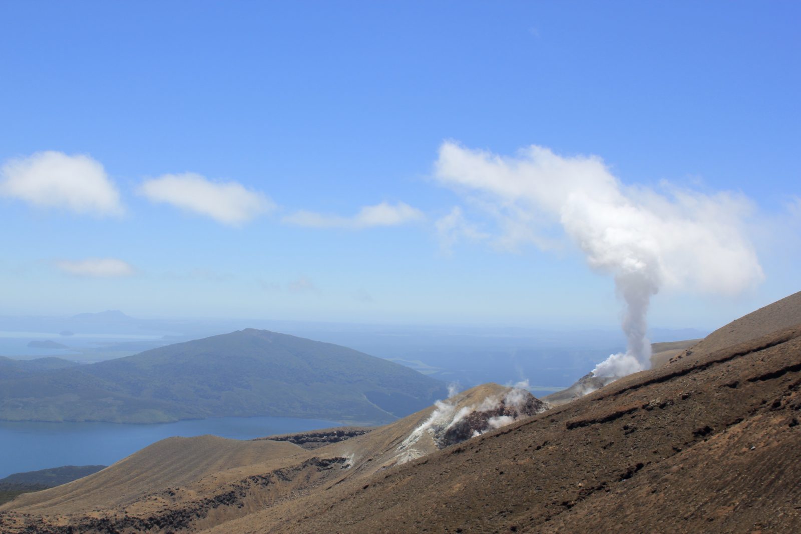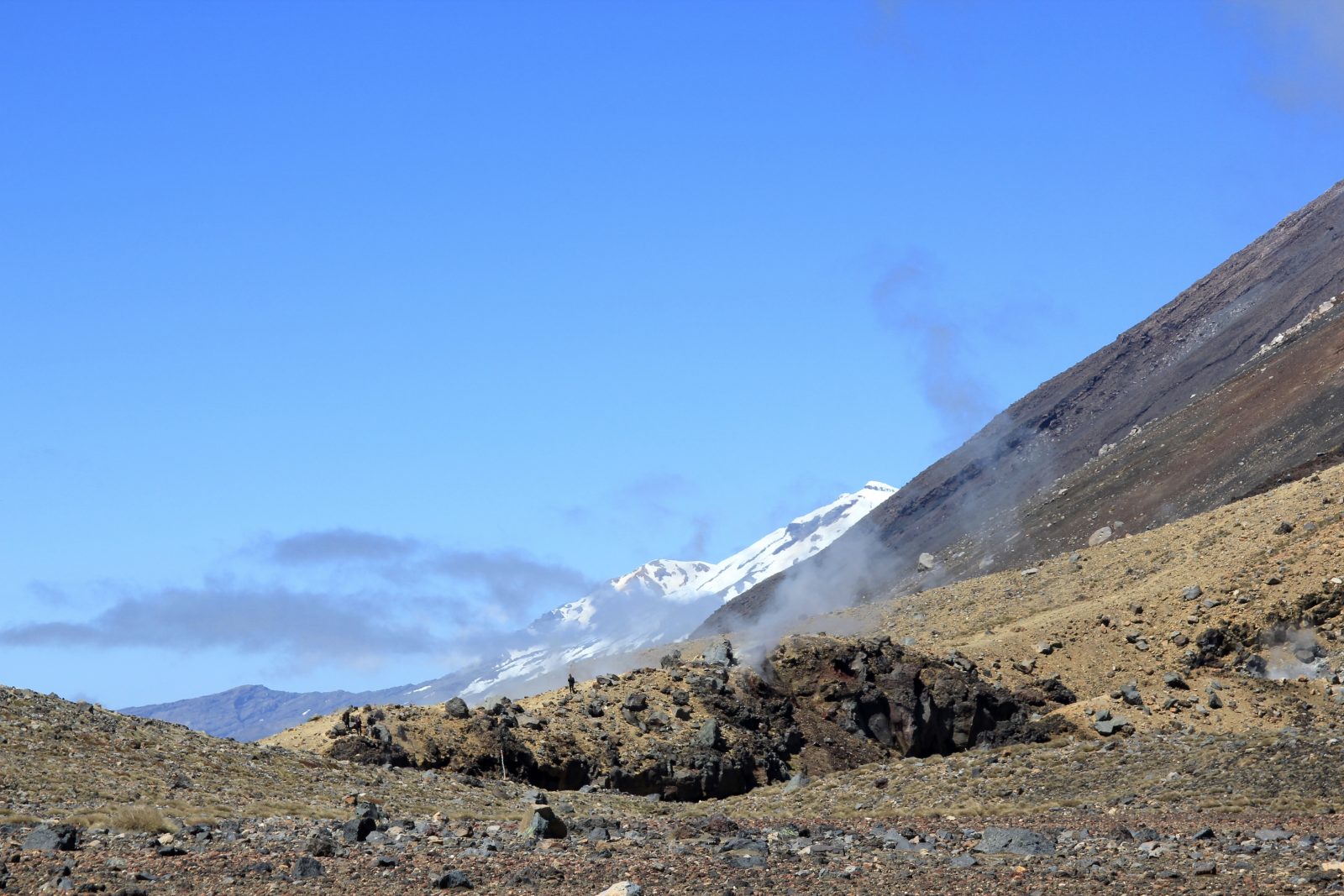 La route longe le lac Taupo, superbe dans sa caldera sur 600 km² avec en arrière plan des montagnes de plus en plus hautes dont nous nous approchons. Direction le parc national Tongariro, volcans avec fumerolles et sommet enneigé.