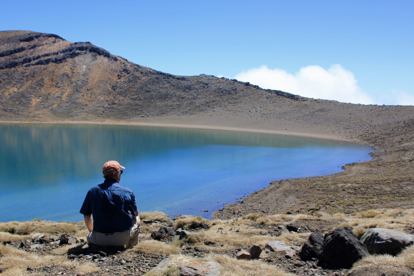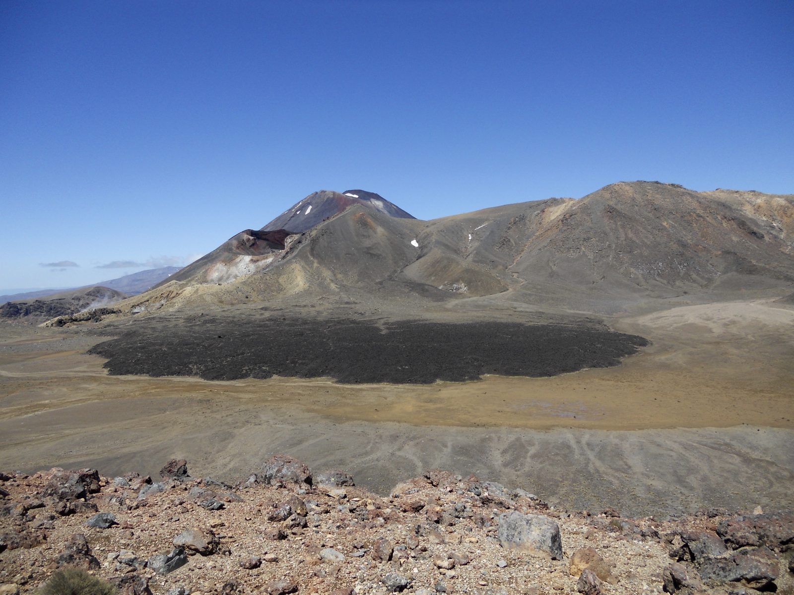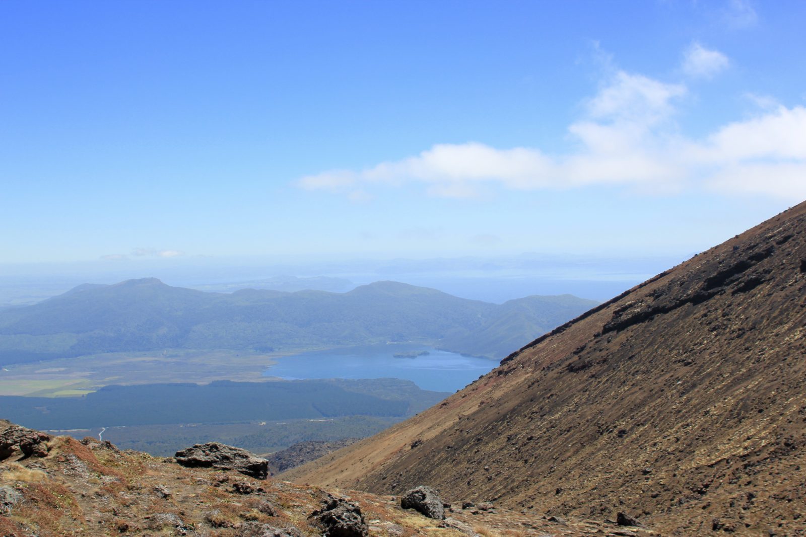 La route longe le lac Taupo, superbe dans sa caldera sur 600 km² avec en arrière plan des montagnes de plus en plus hautes dont nous nous approchons. Direction le parc national Tongariro, volcans avec fumerolles et sommet enneigé.