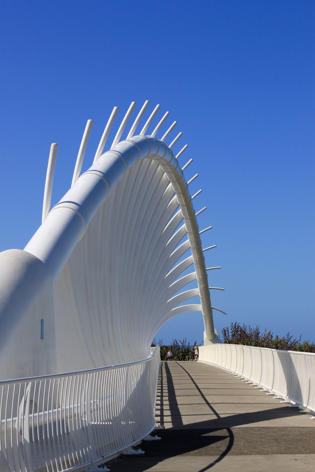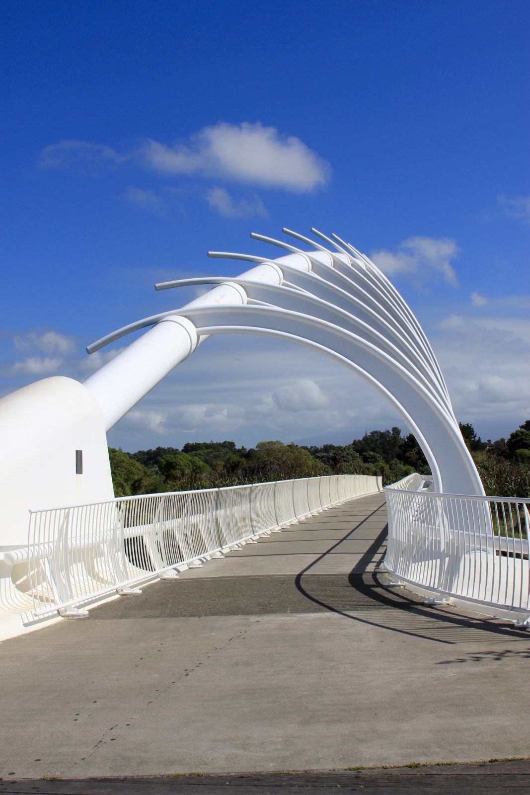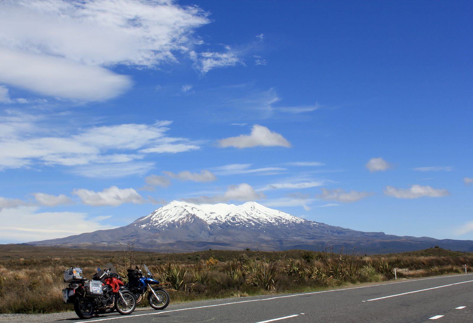Pour la première journée de l’été, nous avons été gâtés: une campagne vallonnée et tellement belle qu’elle donnerait envie à tous les aficionados du trottoir parisien de se mettre au vert pour élever des moutons et faire du fromage de brebis, bio naturellement. Une route à atteindre les sommets du hit-parade des routes « à ne manquer sous aucun prétexte » si tous les motards de France et de Navarre avaient comme nous la chance de les sillonner sous le soleil. Un ciel plus bleu que les pavés d’Ostie. Un volcan enneigé digne des plus beaux manuels de géographie. La mer qui apparait, turquoise, au détour de la route alors que nous n’avons pas encore quitté les montagnes. Une longue promenade sur un chemin en bord de mer jusqu’au pont Te Rewa Rewa aux courbes magnifiques. Et pour finir, un dîner paisible sur le deck de notre hôte airbnb avec une poule et trois chats bien câlins.