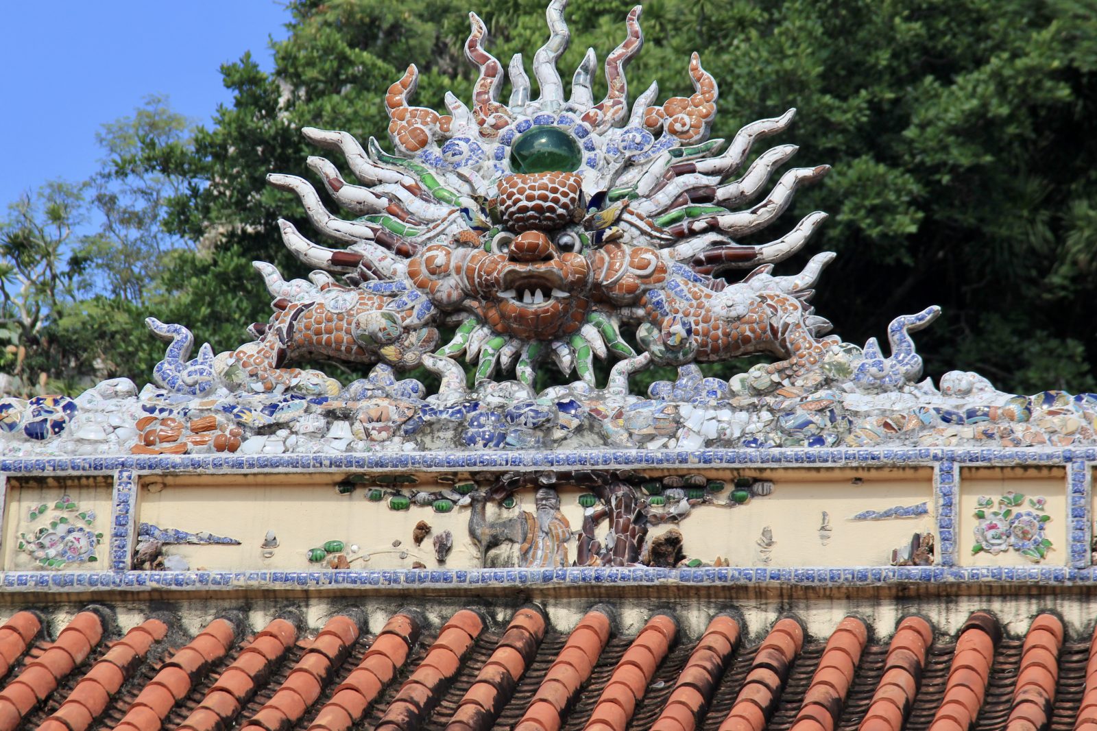 Quelques dragons avec beaucoup de têtes dans une pagode