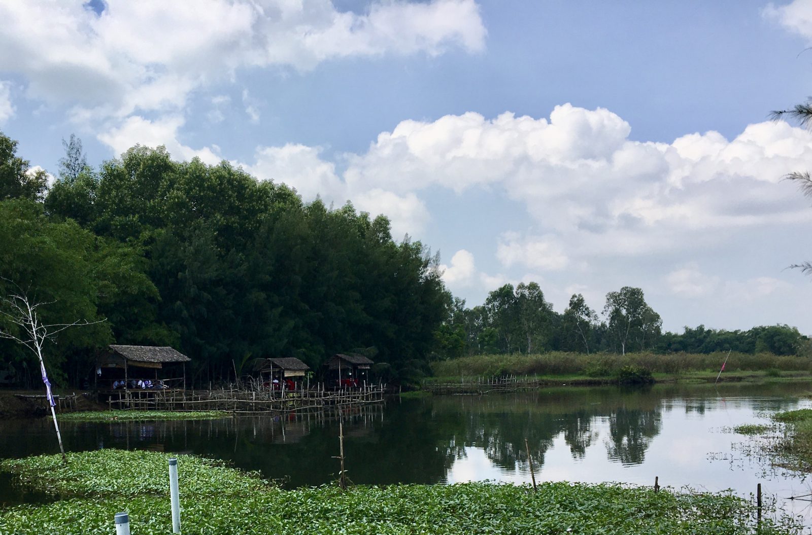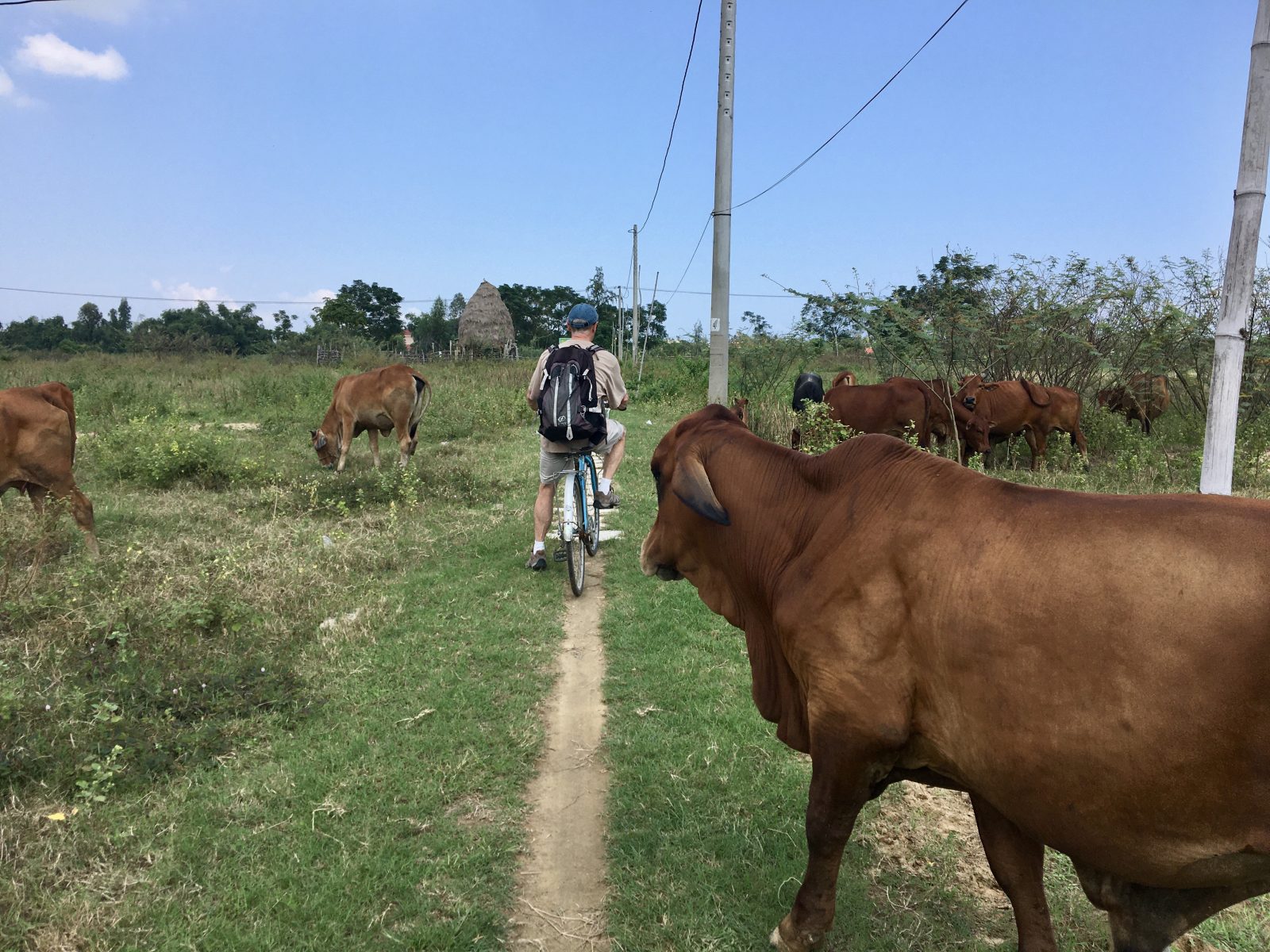 Petits sentiers, villages de pêcheurs, de l’eau partout, des ponts, des bananiers couverts de fruits, des palmiers bien sûr, des temples parfois perdus dans la nature, des vaches, et des maisons de toutes sortes, les gens ont l’air un peu étonnés de nous voir circuler par là tout seuls, ils nous saluent d’un drôle de hello avec un grand sourire, peu habitués aux touristes. Ce fut une belle expérience.