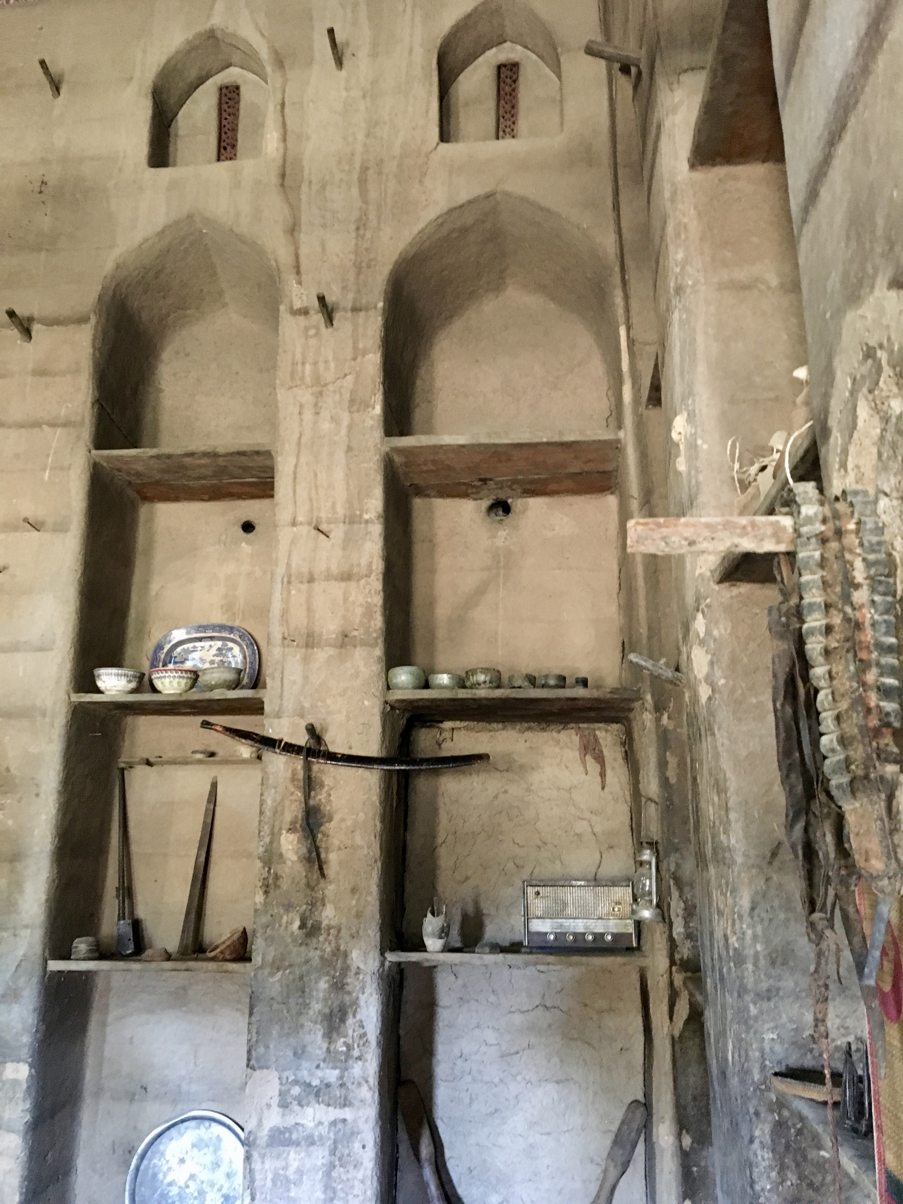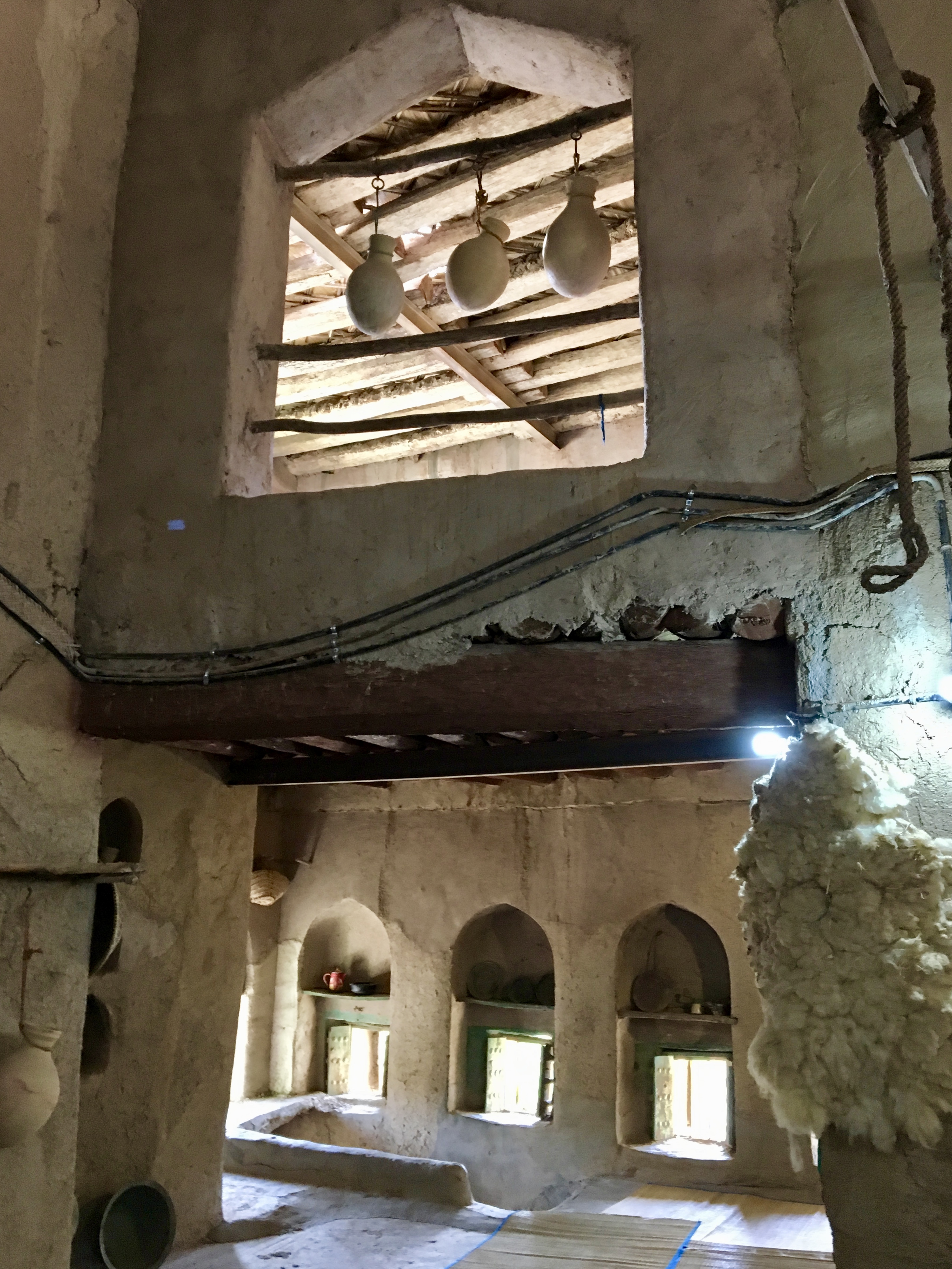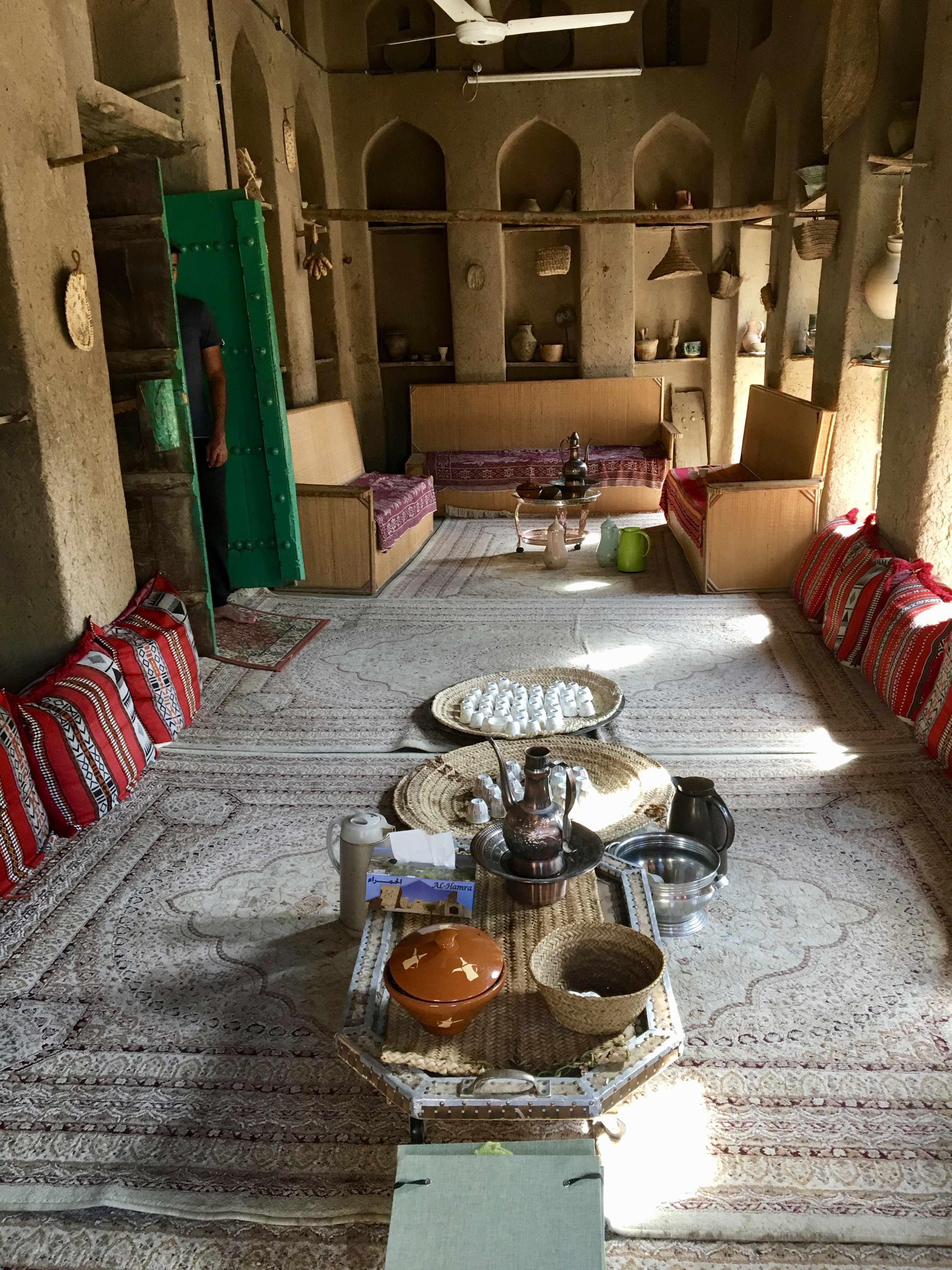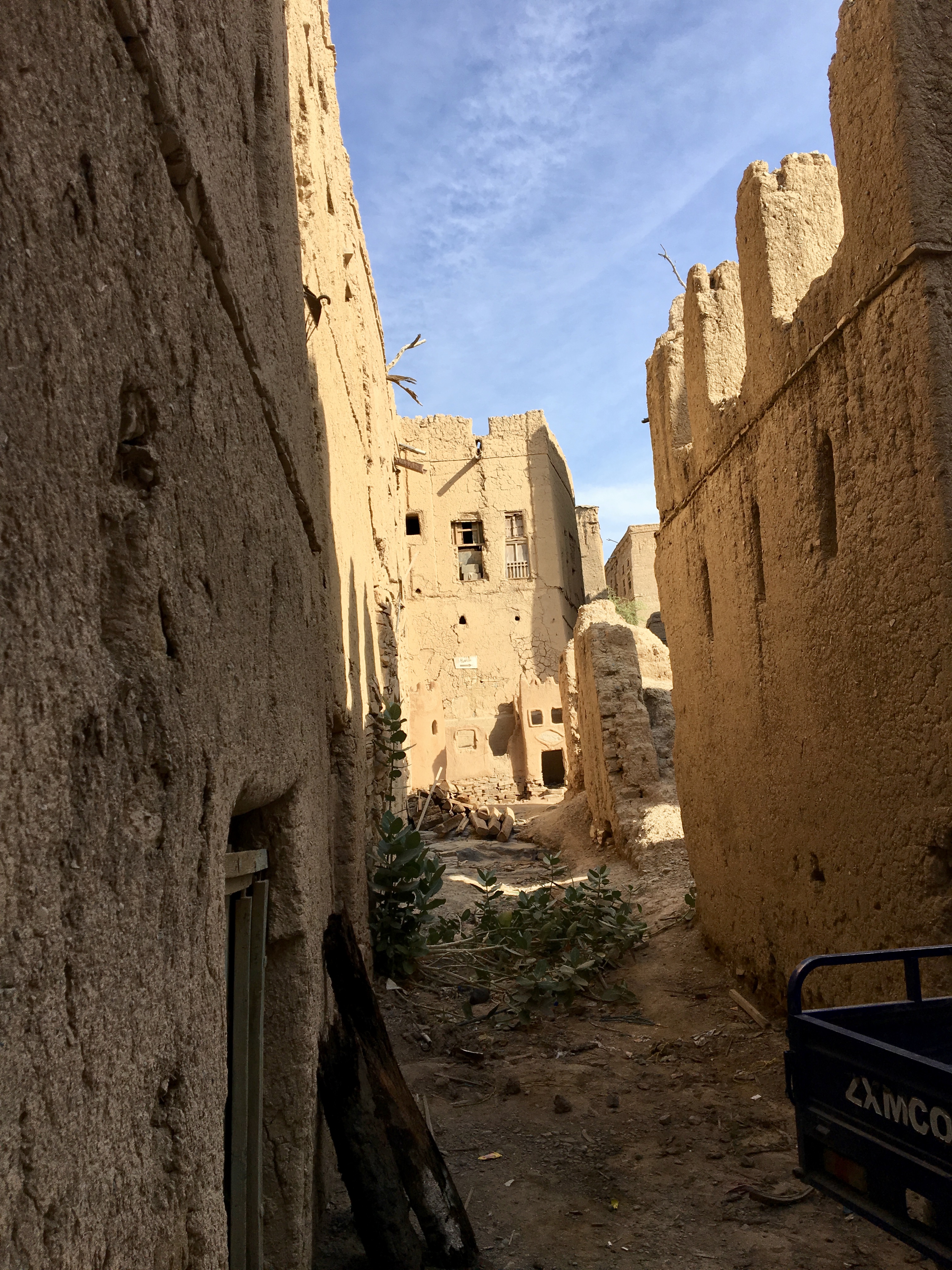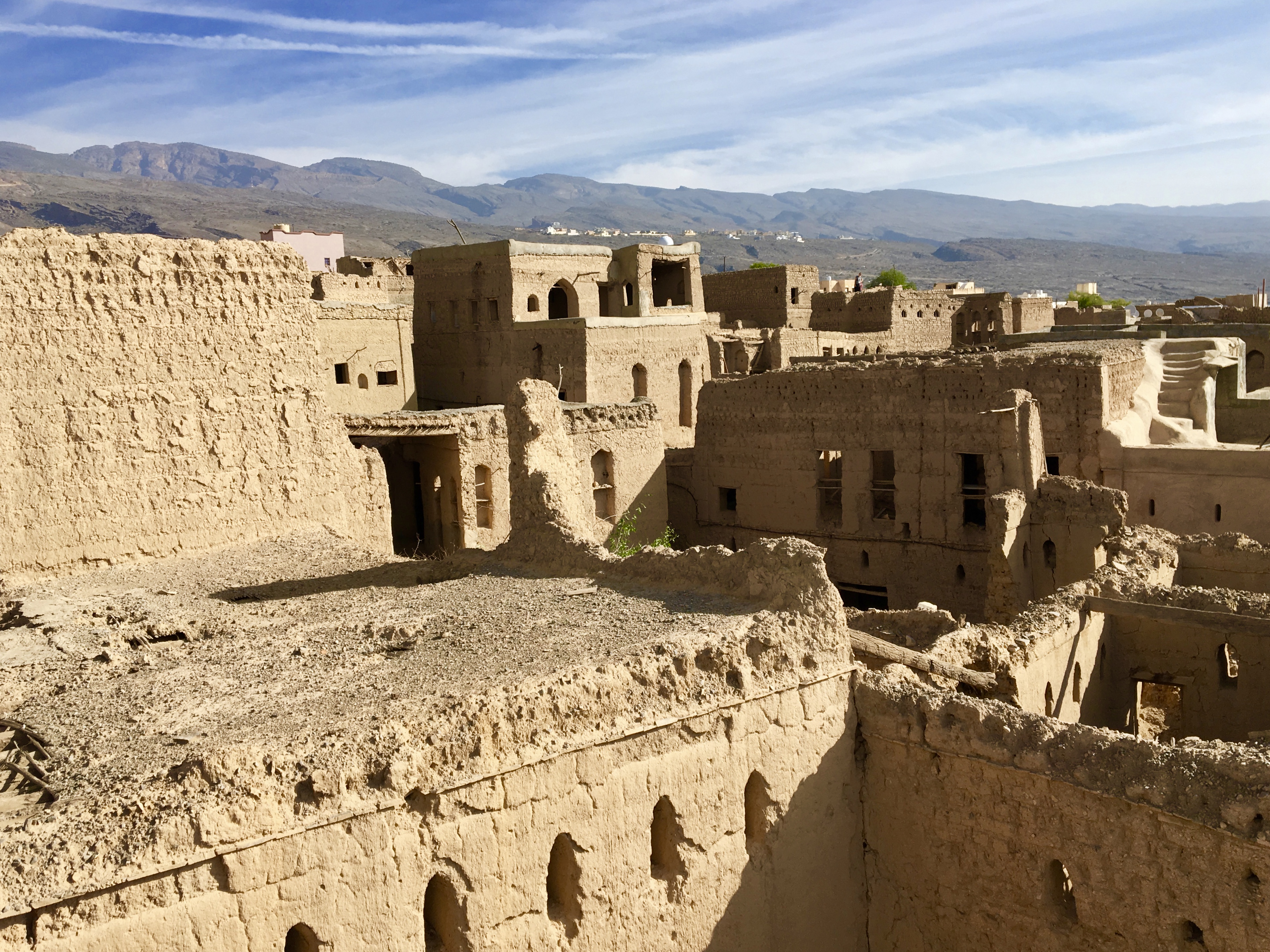 Dans les montagnes du djebel Hajjar,  nous visitons le village de Al Hamra, le rouge, qui porte bien son nom. Les maisons construites il y a plusieurs siècles, sont plutôt délabrées, mais les plus  belles sont restaurées et nous visitons les plus typiques, presque des musées, où nous apprenons tout sur la fabrication du sirop de datte et d’une huile qui soigne tout ou presque.