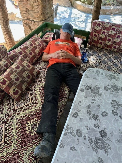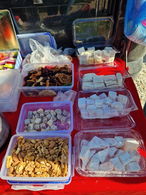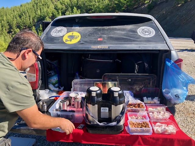 La rituelle pause café, agrémentée de quelques loukoums et autres gâteries: notre guide John est un grand gourmand et nous fait profiter des délices du cru.