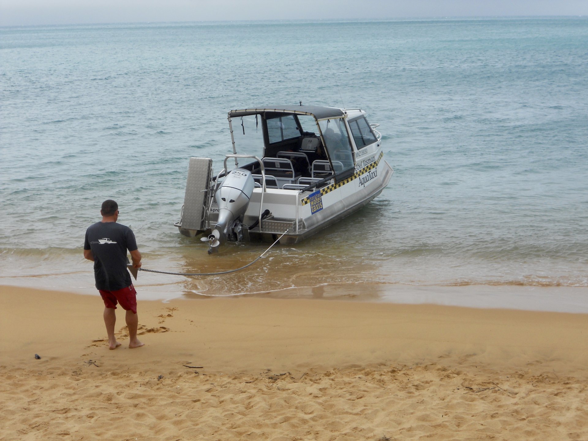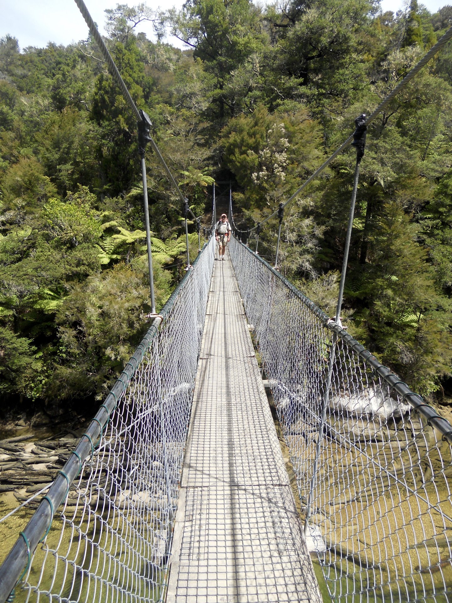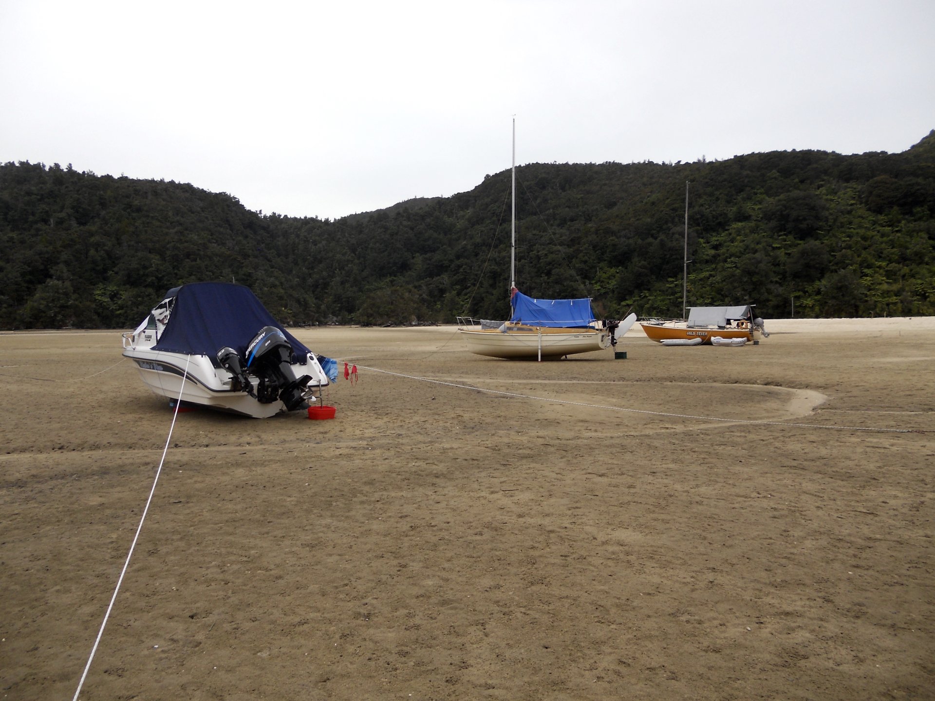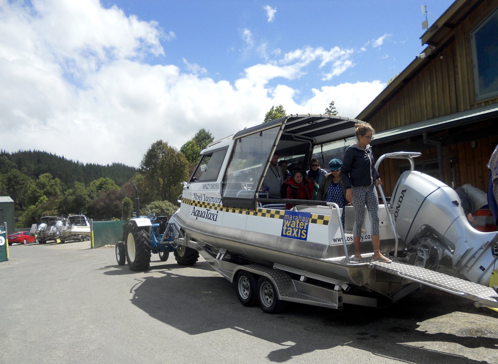 Retour sur Totaranui par la forêt et Gibbs Hill. Il est temps que ça s’arrête: nous mangeons parcimonieusement nos dernières provisions, les chaussures de marche sont en lambeaux (heureusement, il y  a du duct tape pour y remédier en urgence!) et les pieds sont ampoulés. Bien sûr, la mer est forte au retour, mais le bateau est costaud et le capitaine vaillant, une petite douche à l’eau salée et nous voilà arrivés, pris en charge par un tracteur qui nous remorque jusqu’au dépôt, même pas besoin d’un bus pour rentrer!