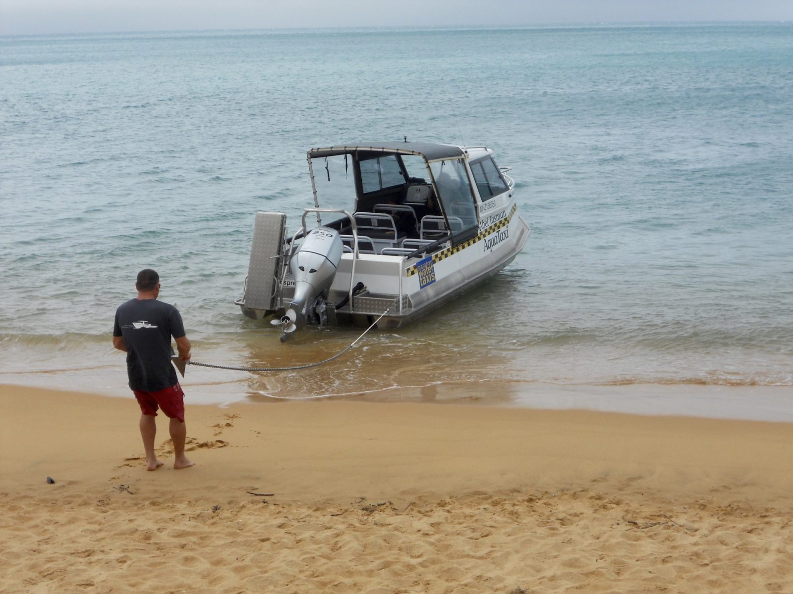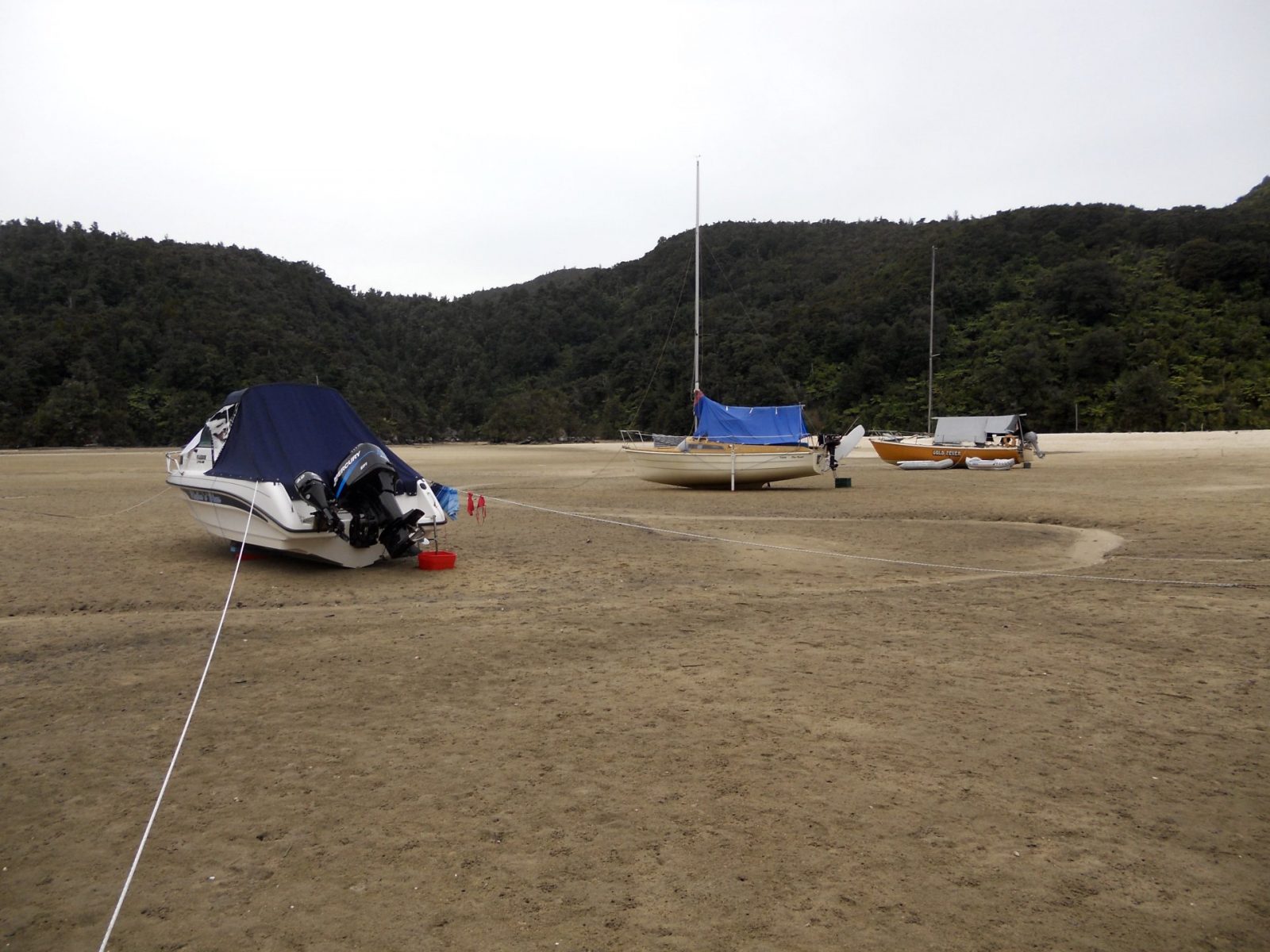 Retour sur Totaranui par la forêt et Gibbs Hill. Il est temps que ça s’arrête: nous mangeons parcimonieusement nos dernières provisions, les chaussures de marche sont en lambeaux (heureusement, il y  a du duct tape pour y remédier en urgence!) et les pieds sont ampoulés. Bien sûr, la mer est forte au retour, mais le bateau est costaud et le capitaine vaillant, une petite douche à l’eau salée et nous voilà arrivés, pris en charge par un tracteur qui nous remorque jusqu’au dépôt, même pas besoin d’un bus pour rentrer!