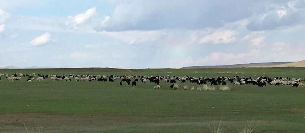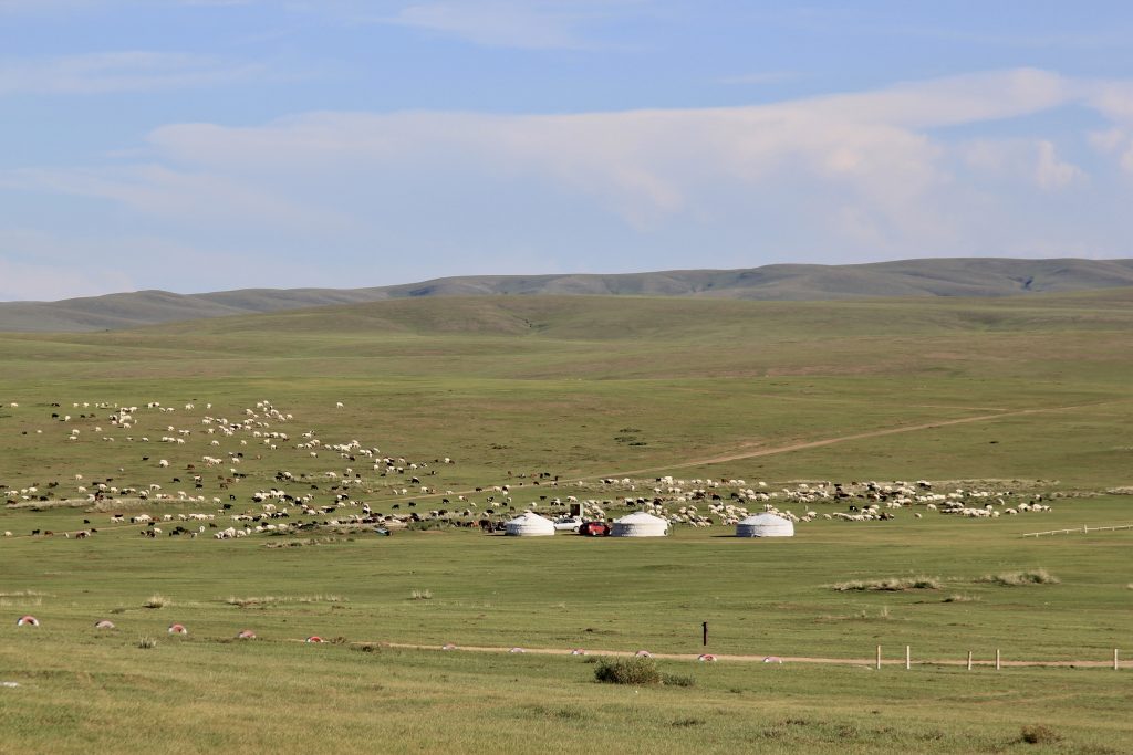 Nous traversons la grande steppe mongole, cet espace sans limites, presque désertique, où d’immenses troupeaux peinent à trouver leur pâture.