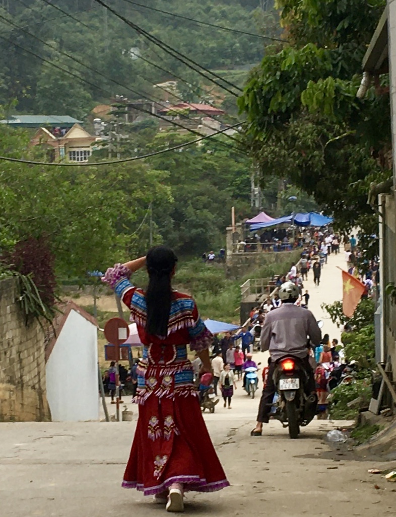4h du matin, il fait nuit noire, et les scooters ont déjà pris possession de la rue, à grand renfort de klaxons: c’est l’installation du grand marché dominical de Bac Ha, qui rassemble les différentes ethnies de la région, un évènement. Vers 7h, le marché bat son plein et depuis notre terrasse nous observons la rue grouillante, le spectacle est fascinant!
