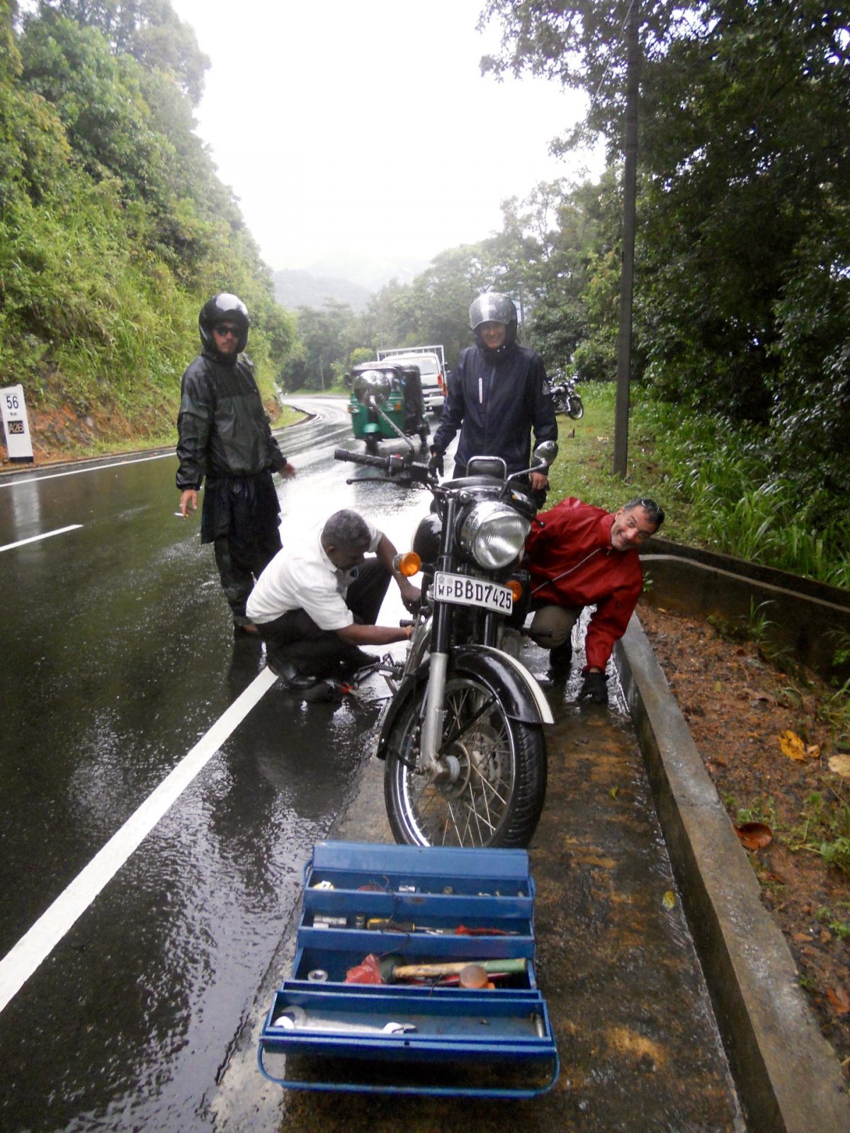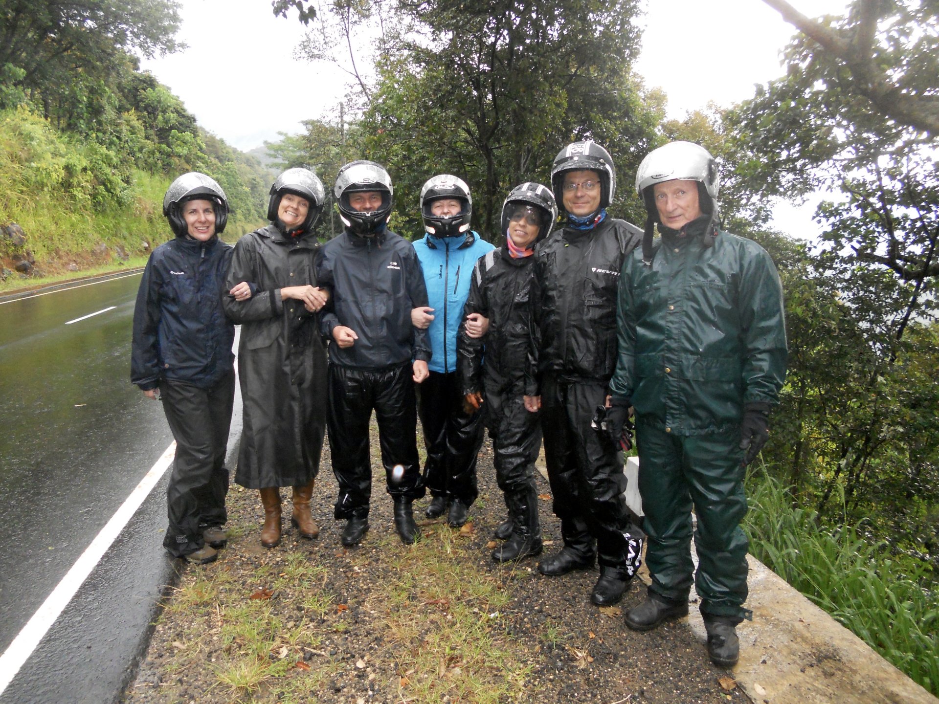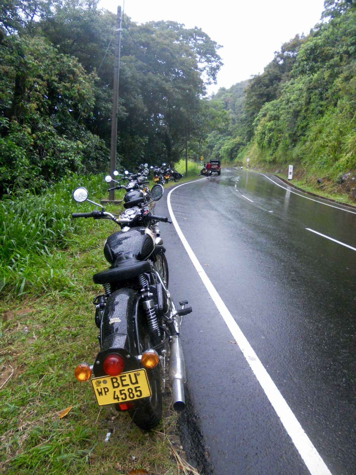 La pluie tropicale nous a un peu transformés en pingouins, j’espère que vous apprécierez le défilé de mode sur le bord de la route.