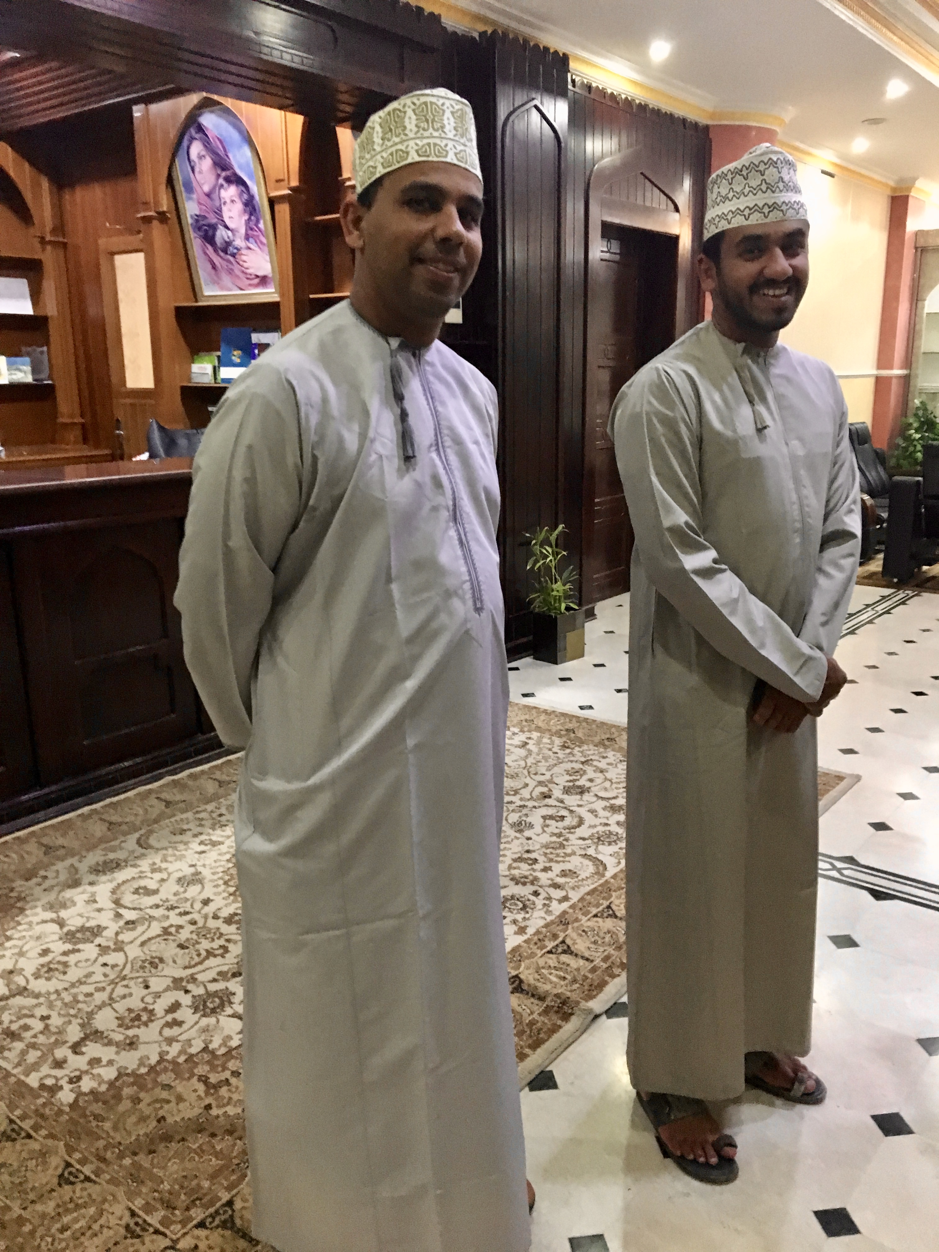 Et là, belle surprise, nos deux Soulaiman, dans l’ordre hiérarchique, nous attendent pour dîner dans leur costume traditionnel, tradition oblige en ville.