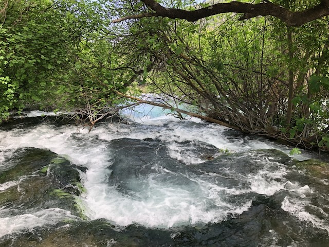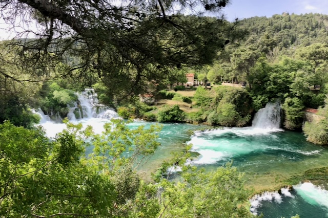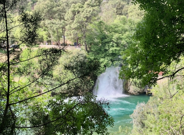 Nous partons visiter le parc national de Krka: à une quinzaine de kilomètres de Sibenik: des montagnes couvertes de forêts, creusées par une rivière tumultueuse qui s’élargit parfois en grands lacs et tombe en une succession de cascades, de plateau karstique en plateau karstique.