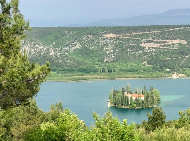 Et nous finissons même par trouver la route qui mène là haut sur la montagne au point de vue sur l’ilot de Visovac: cela ne vaut pas une photo de drone, mais montre bien néanmoins l’isolement et la sérénité des lieux.