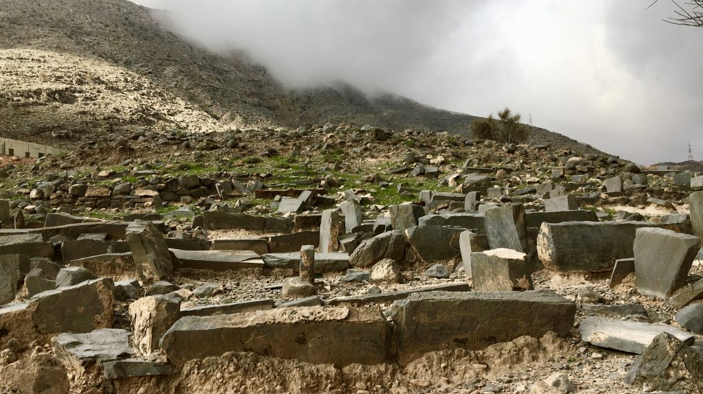 Mais les Omanais n’habitent plus sur place, ils se sont installés dans une belle maison à Khasab et envoient sur place quelques ouvriers indiens ou bangladais pour cultiver et s’occuper des chèvres. Eux travaillent dur et n’ont pas grande considération. Le cimetière ancien nous interpelle: pas de pierre tombale ni d’inscription, juste deux pierres verticales à la tête et aux pieds et des cailloux. Le corps est couché sur le côté, en direction de la Mecque.