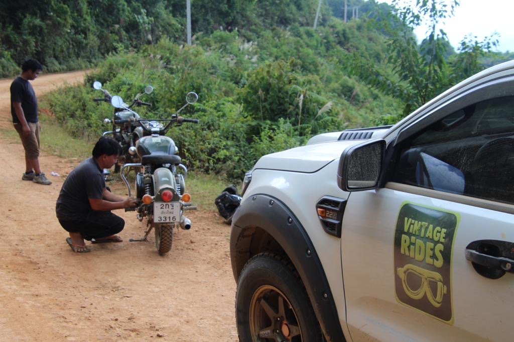 Entre temps, une moto capricieuse a calé et n’a pas voulu redémarrer. Leg, notre super mécanicien, a fini par trouver la panne:  une petite cosse qui n’avait pas aimé les bosses.