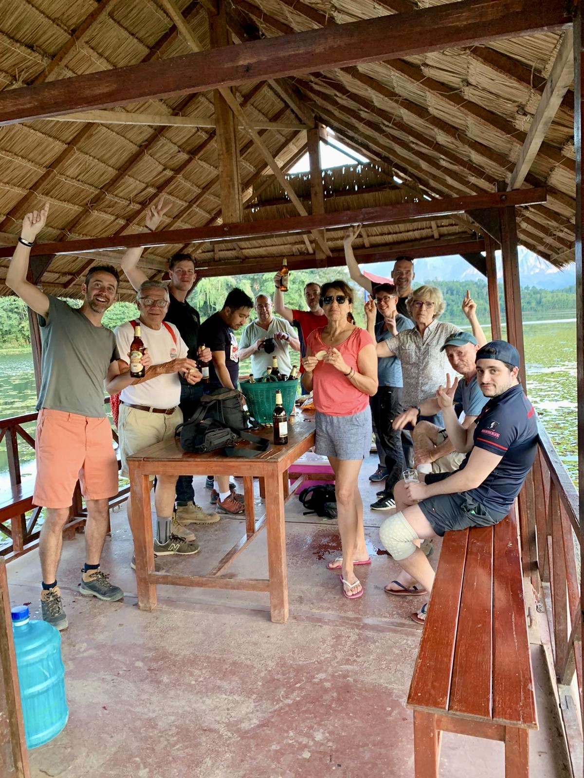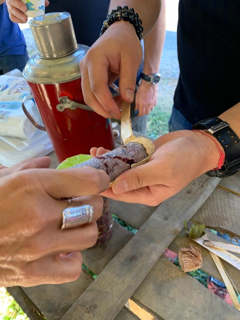 Départ matinal, puis pause café dans un petit village. Ça tombe bien, de charmantes petites dames nous proposent ici quelques friandises alléchantes: il n’y a qu’à les faire griller sur le canoun, on accompagne ça d’un peu de riz gluant mauve au lait de coco dans un morceau de bambou et le déjeuner est prêt!