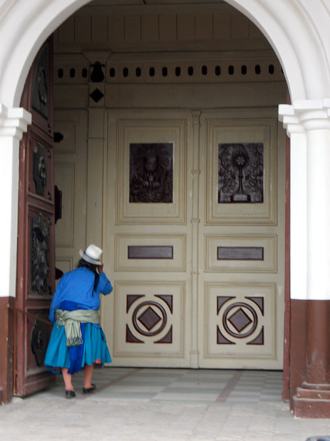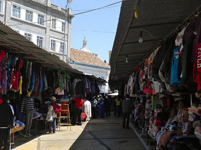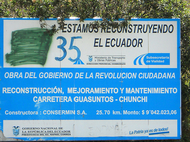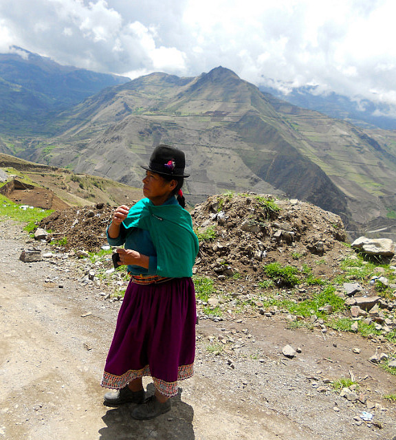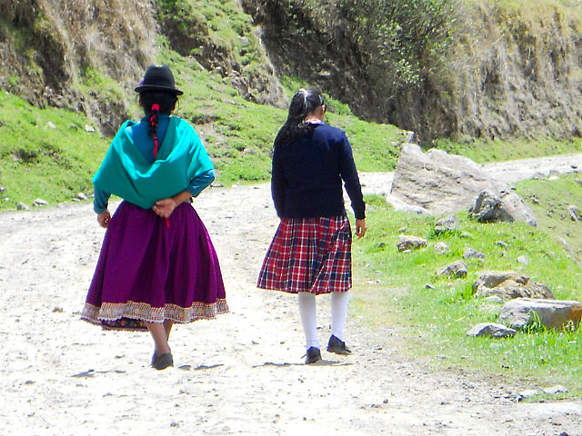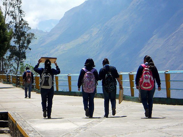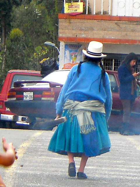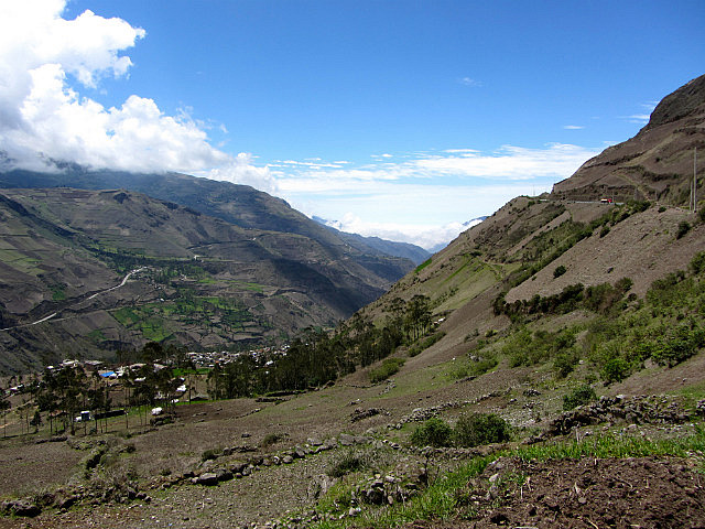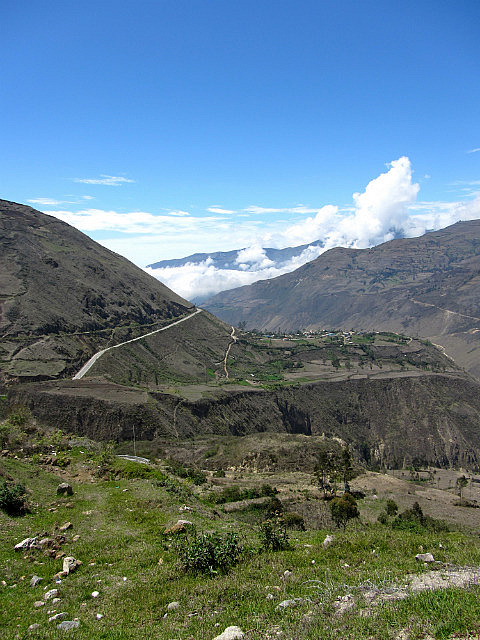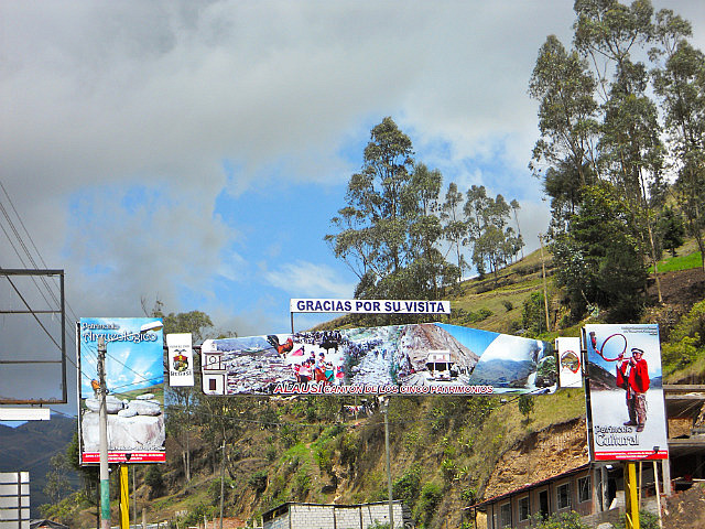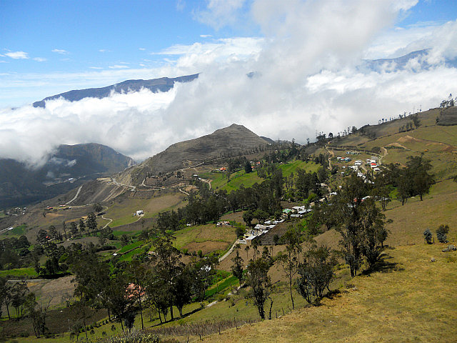 Puisque j’ai oublié dans le frigo de l’hôtel de Baños la salade avocat/papaye/courgettes/choclos (haricots blancs) que nous avions préparée avec amour, huile d’olive et citron le matin même, nous nous arrêtons pour déjeuner dans un petit village de montagne: les restaurants au bord de la route préparent le menu du jour, soupe, viande avec riz et pommes de terre et un jus de fruits frais. J’ai presque honte lorsque l’on m’annonce le prix: 2 dollars l’almuerzo. Beaucoup moins frais que ma salade, c’est sûr, mais pas mal.