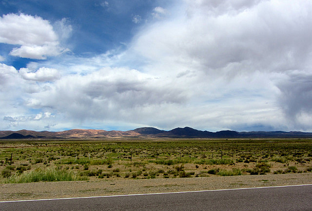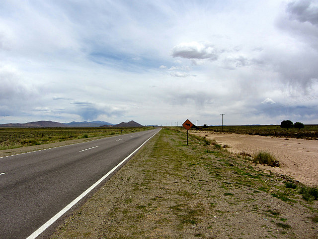La route, droite à perte de vue, traverse une grande plaine avant d’arriver dans les montagnes.