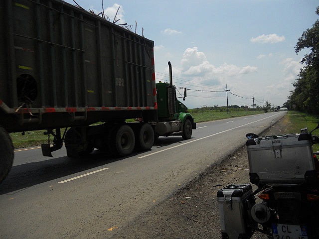 En route pour Cali sur cette superbe autoroute qui longe une chaîne de montagnes, paysage splendide et route facile. Bien sûr, ce n’est jamais sans surprise: une carriole tirée par un cheval traverse tranquillement les voies, des piétons traversent en courant (Eliane et Jacques ne sont pas les seuls….) puis trois chevaux en liberté broutent l’herbe du vaste terre plein central, il faut toujours être sur le qui vive.