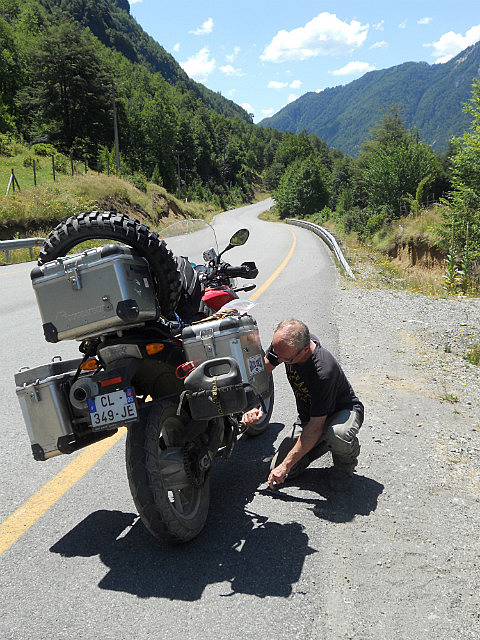 Plus tard, il s’arrêtera sur le bord de la route, son frein arrière chauffant anormalement: l’arme du crime est tout de suite repérée, il s’agit d’un petit caillou qui, non content de nous embêter sur la route, s’est coincé dans le levier de frein juste au moment où il pouvait s’y loger sans prévenir personne: quelle goujaterie, vous en conviendrez.