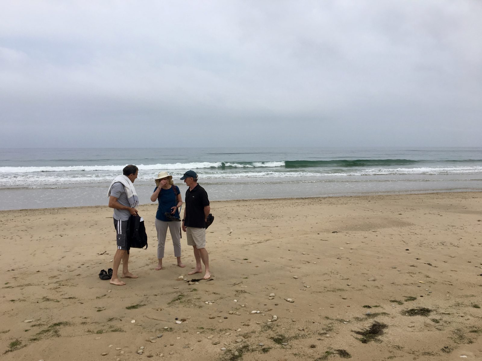 Le lendemain, balade et baignade à la plage de la Conche avec Kathleen et Marie Liz, quelques surfeurs attendent les belles vagues: