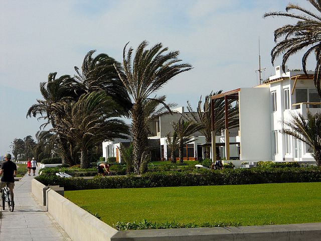 Je n’avais pas gardé un très bon souvenir de Lima lors de notre passage il y a une dizaine d’années: une grande métropole latino-américaine envahie de brouillard, mais c’était l’hiver. Nous l’avons trouvée beaucoup plus souriante sous le soleil, très vivante, et très moderne: MacDonald’s, Starbuck Coffee, des banques les unes après les autres, Brad Pitt qui me fait un clin d’oeil derrière la vitrine en me proposant un flacon de 5 de Chanel, un supermarché immense et très bien achalandé à faire pâlir d’envie les mousquetaires de la distribution, des restaurants chics remplis de jeunes cadres dynamiques, une ville bien moderne. Mais bien sûr, nous étions dans un bon quartier.