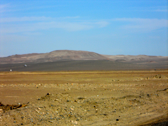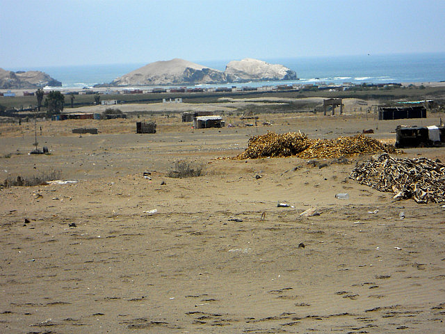 Le désert est partout en bord de mer, pas un arbre, un vent violent, quelques cabanons bien alignés où l’on ne voit personne, des maisons écroulées, cela ressemble à des villages fantômes: sans doute les séquelles du séisme de 2007.