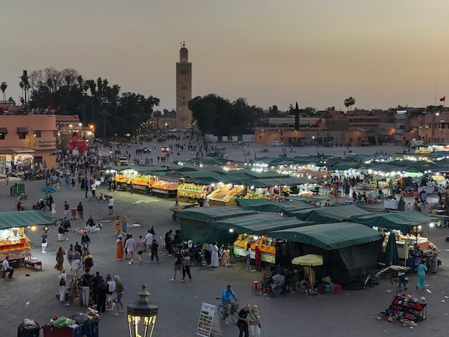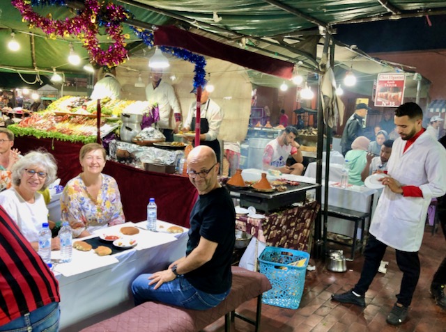 La place Jamaa El-Fna le soir, où nous dînons dans l’une des nombreuses petites gargotes éphèmères.