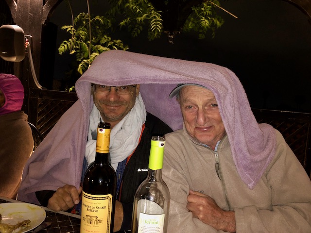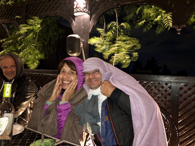 Et ce soir, Michèle, Andrick et le reste du groupe arrivent pour un dîner, toujours en terrasse, mais bien venté, toujours aussi joyeux, et plein de drôles de couvertures pour y remédier.