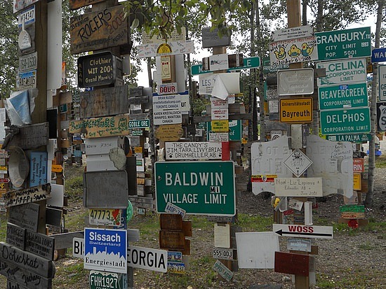 Nous arrivons à la fin de l’Alaska Highway, à Watson Lake, là où les voyageurs laissent un signe de leur passage sur des poteaux prévus à cet effet: nous n’avons pas retrouvé le biberon de Justine laissé il y a 19 ans, mais nous n’y comptions pas vraiment.