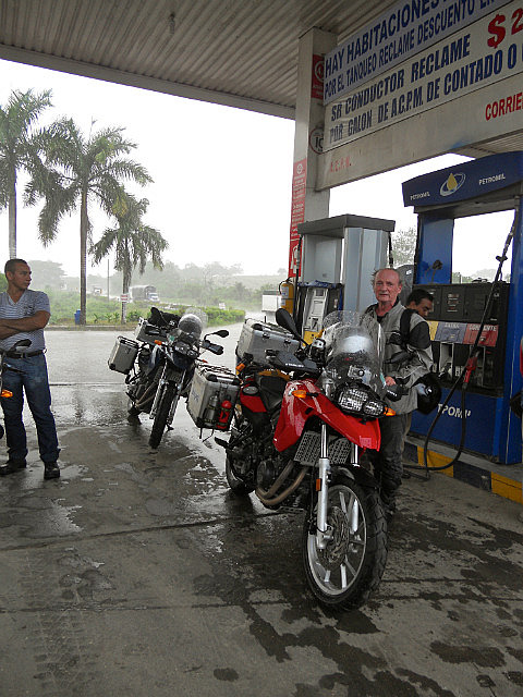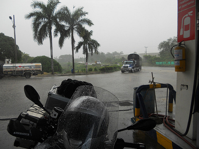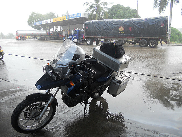 Et puis bien sûr, parcours initiatique oblige, nous avons eu droit à un orage: tout s’est passe si vite que nous n’avons même pas eu le temps de nous abriter à temps: il est tombé une pluie torrentielle qui nous a finalement rafraîchis, la température étant passée de 35 à 25 degrés en quelques minutes. Arrêt dans une station service avec un grand toit, envahie par les deux-roues venus s’abriter.