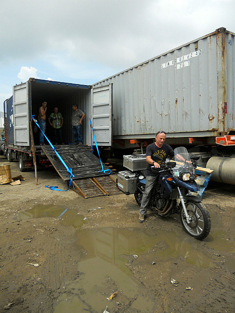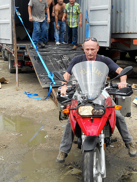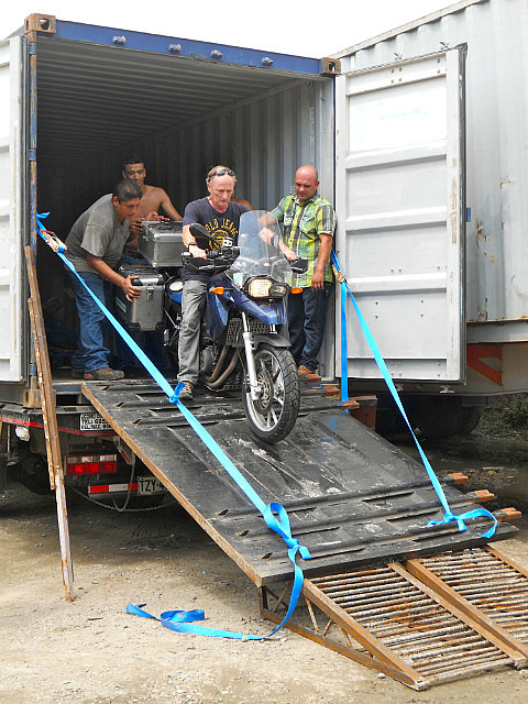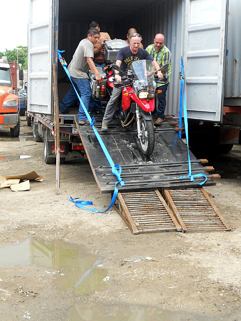 Bien sûr, pas tout à fait comme prévu: le conteneur devait être déposé par terre pour que nous puissions sortir les motos facilement, et bien non!
