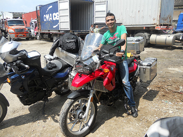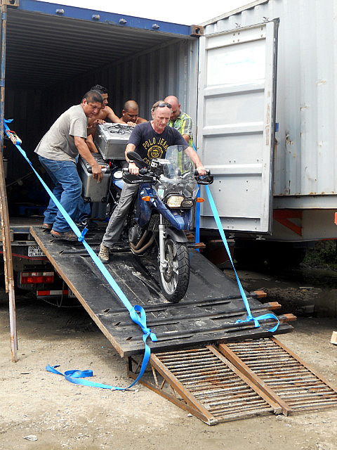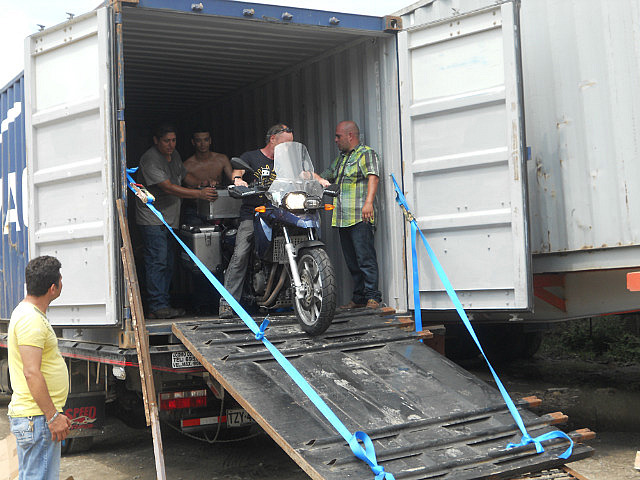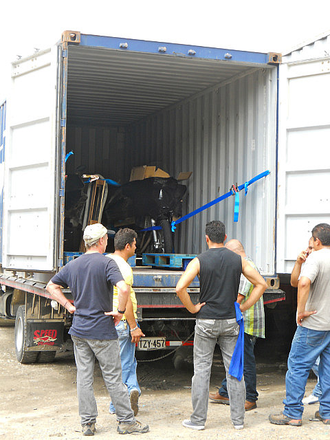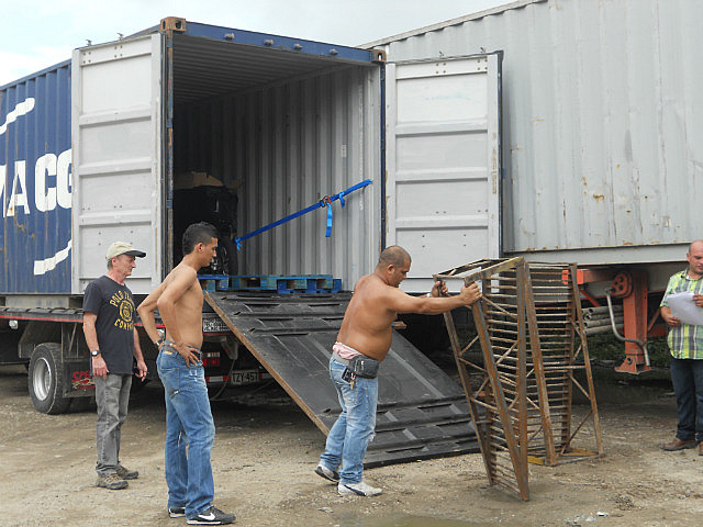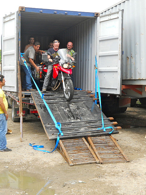 Le conteneur est resté sur le camion, et l’on a « construit » une rampe avec les moyens du bord: les colombiens sont vraiment très inventifs et très rusés, mais je ne sais pas s’ils réalisaient bien le risque. Décharge d’adrénaline assurée pour nous, mais surtout pour Pilou qui s’est chargé de la besogne.