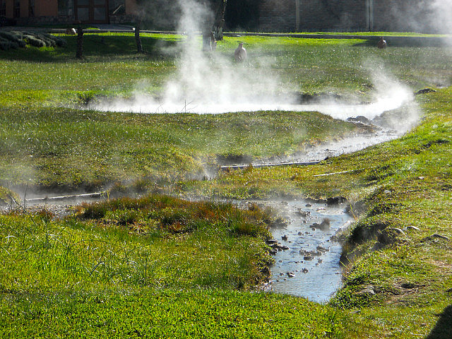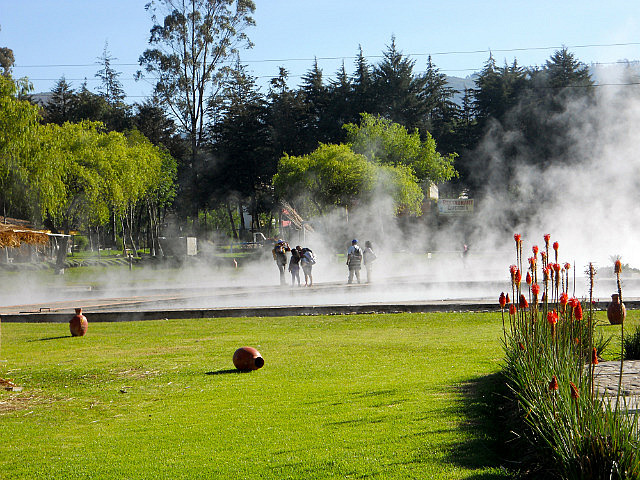 Etape à Baños del Inca, sources d’eau chaude et charmant bungalow près des thermes, avec des bassins d’eau à 70 degrés Celsius qui se vaporise dans l’air ambiant.