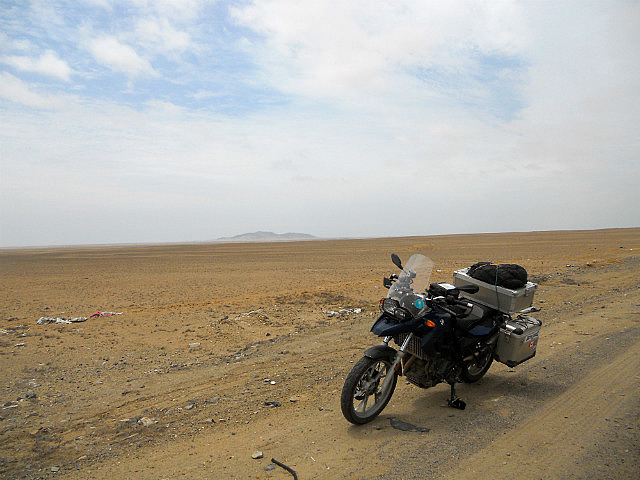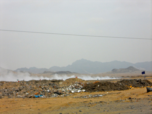 Curieusement, à la sortie de la ville, nous nous retrouvons dans le désert, le vrai, sable, quelques dunes, un vent fort, aucune végétation, juste des sacs poubelles et des immondices traînant partout, c’est affligeant.