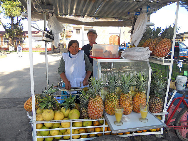 Cette marchande qui presse ses oranges à la demande commence à 61/2 h du matin et finit à 7h1/2 du soir, toujours avec le sourire, et quand elle ne presse pas, elle tricote.