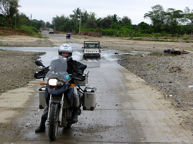 Sauf que cette route est en travaux et nous vaut une cinquantaine de kilomètres de piste de terre, caillouteuse à souhait. On y contrôle mieux la moto debout sur les repose-pieds (centre de gravité plus bas), mais cinquante kilomètres ainsi, c’est long et éprouvant, de la poussière partout, des camions qui roulent vite, des virages en épingle pas faciles à gérer, nous arrivons près de la côte à la nuit tombée, nous qui nous étions promis de ne jamais rouler de nuit.