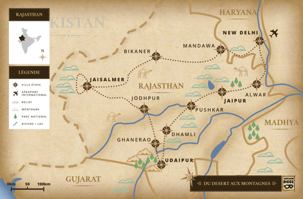 Un deuxième voyage à moto avec Vintage Rides au Rajasthan avec des Royal Enfield: des paysages splendides, des villages perdus, des palais somptueux, des pistes bien chaotiques, des villes superbes au bord de lacs immenses, des vaches partout, des forteresses impressionnantes, des hôtels magnifiques, des temples majestueux, des chemins de terre dans la forêt, un charmeur de serpents, des routes très encombrées, des enfants au regard perçant, des dromadaires attelés, des arbres immenses, une circulation affolante dans les villes, des singes entreprenants, du chaï qui sent bon la cardamome, des hommes qui jouent aux cartes à l’ombre d’un arbre, des parfums enivrants, des chemins de sable doré qui glissent beaucoup, des lacs qui respirent la quiétude, des villages aux ruelles surpeuplées, des endroits du bout du monde, et même des déserts de sable avec de vraies dunes où nous avons dormi à la belle étoile. Tout cela,  et bien plus encore, c’est le Rajasthan que nous avons découvert en une quinzaine de jours au sein de notre Dream Team.