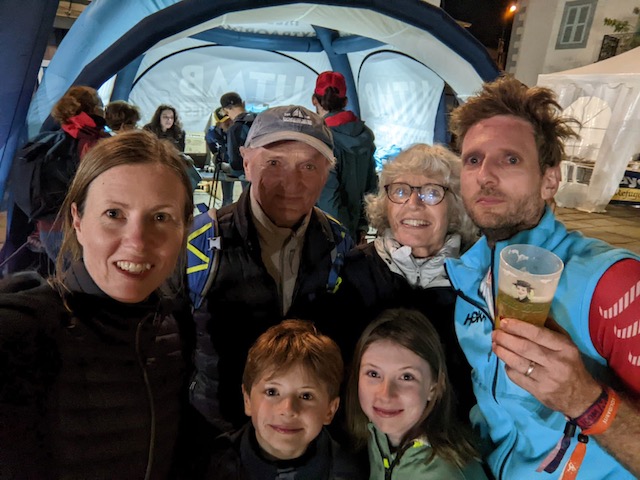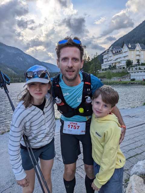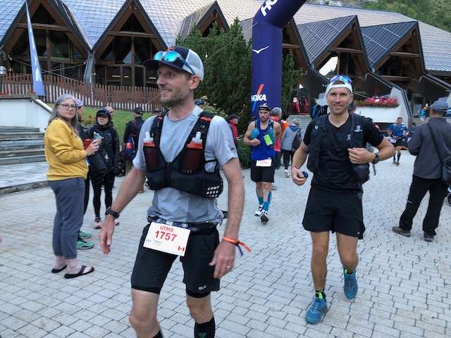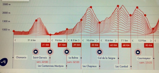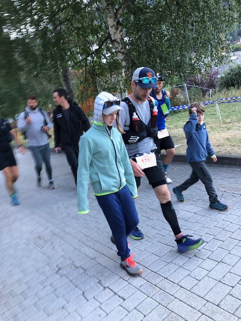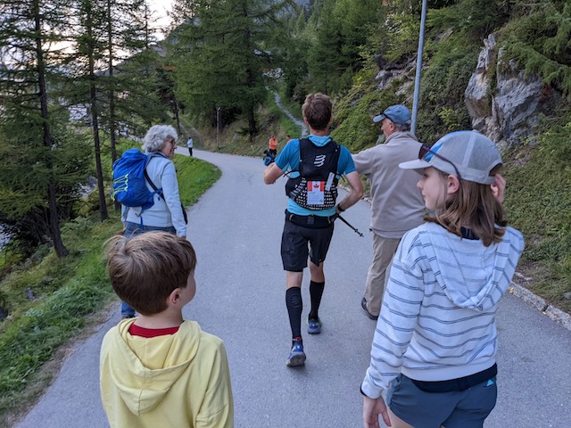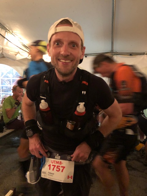 Il est 22h28 et il repart pour une longue nuit de course à la lampe frontale, quelque 50 km de sentiers dans le noir, nous le retrouverons demain matin à Courmayeur en Italie où nous arrivons vers 6h30 pour être sûrs de ne pas le rater.