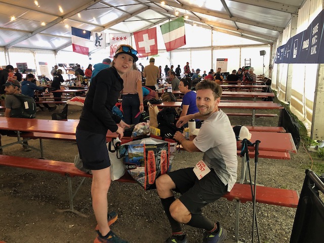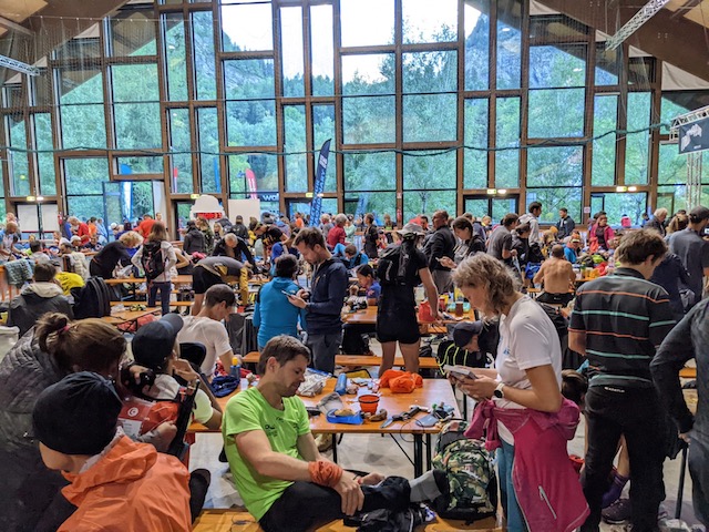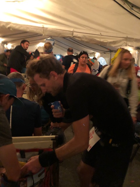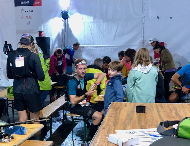 Nous arrivons aux Contamines où le règlement autorise l’un d’entre nous à assister notre coureur: réconfort, tee-shirt sec, quelques calories pour tenir toute la nuit. C’est l’effervescence dans la tente des coureurs.