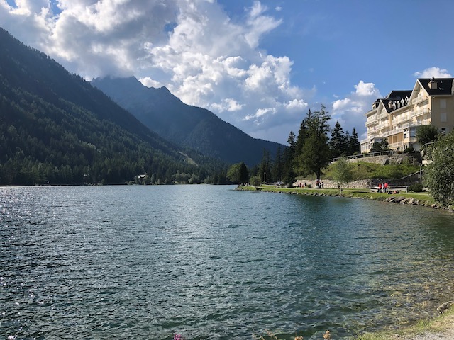 Arrivés à Orsières, il faut laisser la voiture, trop de monde sur ces petites routes sinon, et prendre le bus de l’UTMB qui nous amène, après de vertigineux virages en épingle à cheveux, à Champex-Lac. La montée a du être dure pour les coureurs…