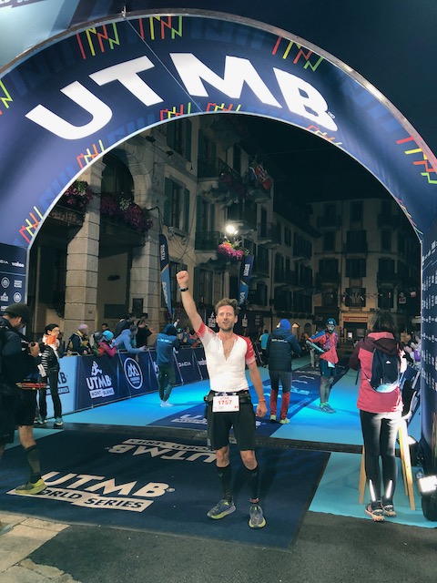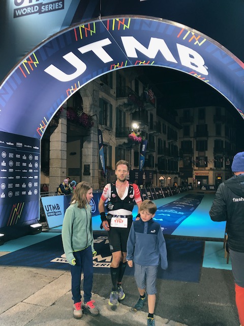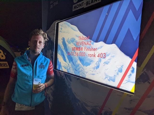 Après la longue descente de la Flégère, c’est l’arrivée sous l’arche de Chamonix. La foule n’est pas immense à 4h53 du matin, mais le fan club est là pour ovationner son idole: le voilà, il l’a fait, et quelle performance!: un peu moins de 35h de course, et il tient toujours debout. Bravo Thibaut!